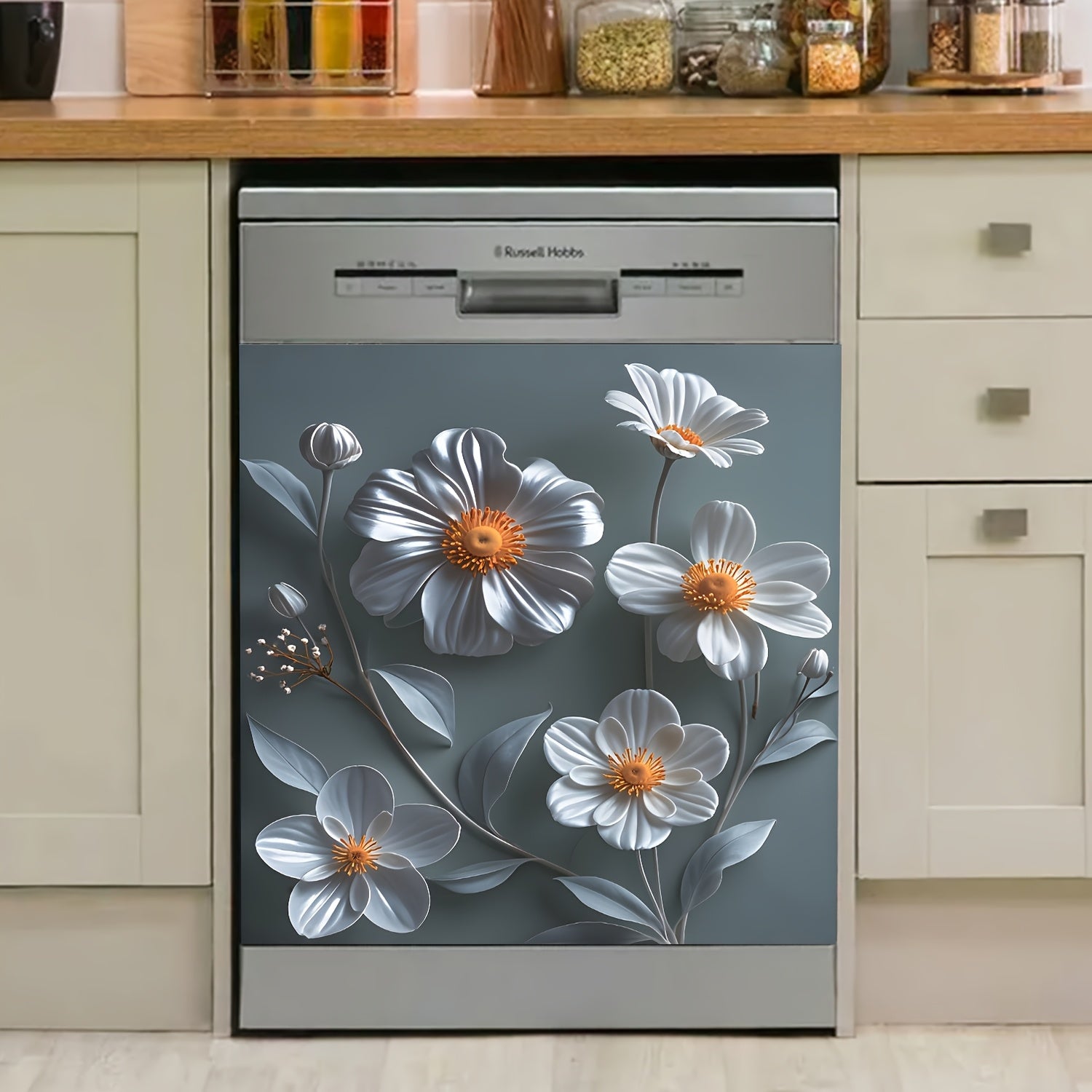 Magnetic Dishwasher Cover Reusable PVC Floral Sticker for Fridge Cabinet White Gray Daisy