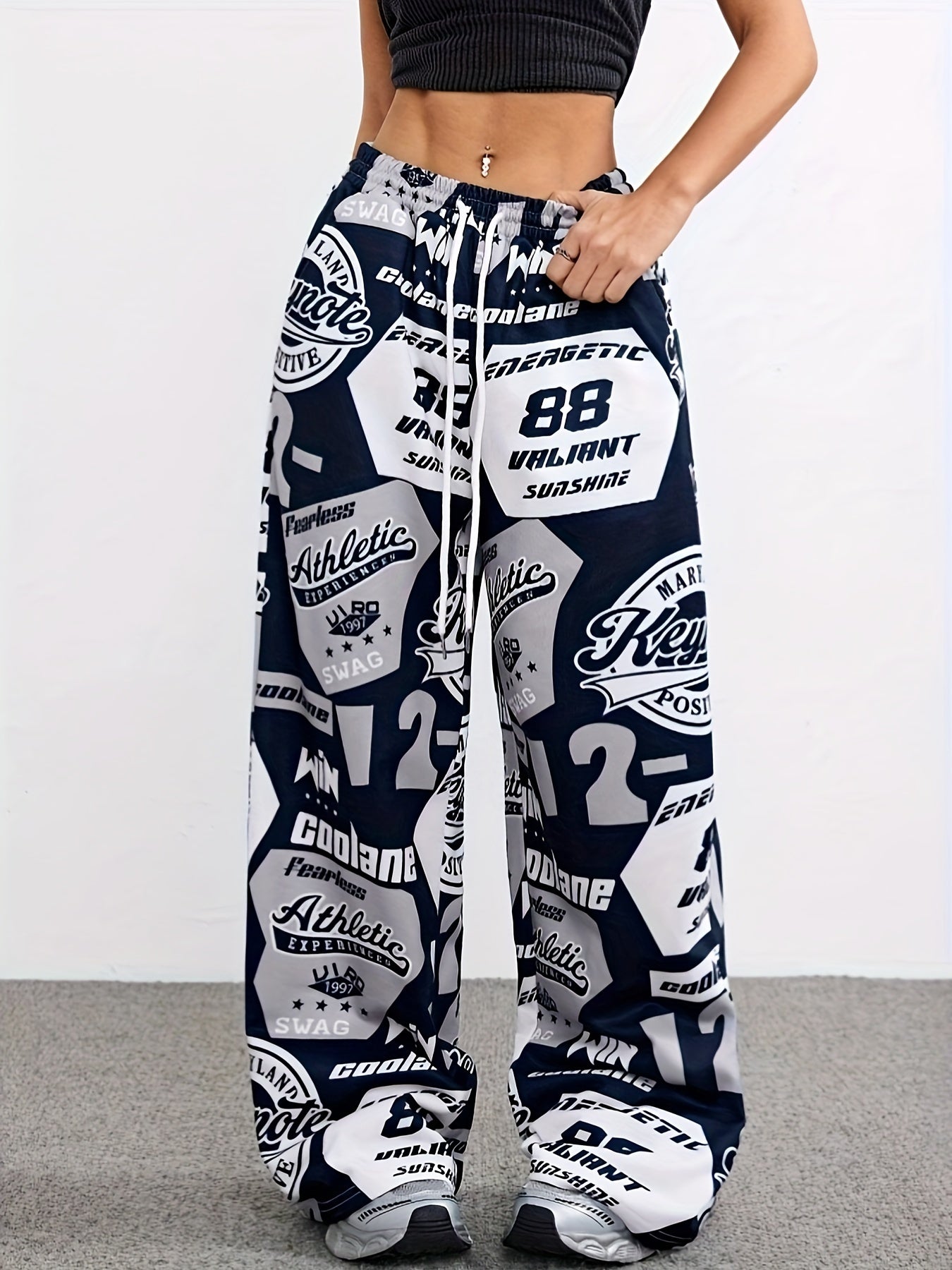 Women's Y2K Style Wide Leg Casual Soccer Pants with Letter Print Polyester Knit Drawstring Waist All-Season
