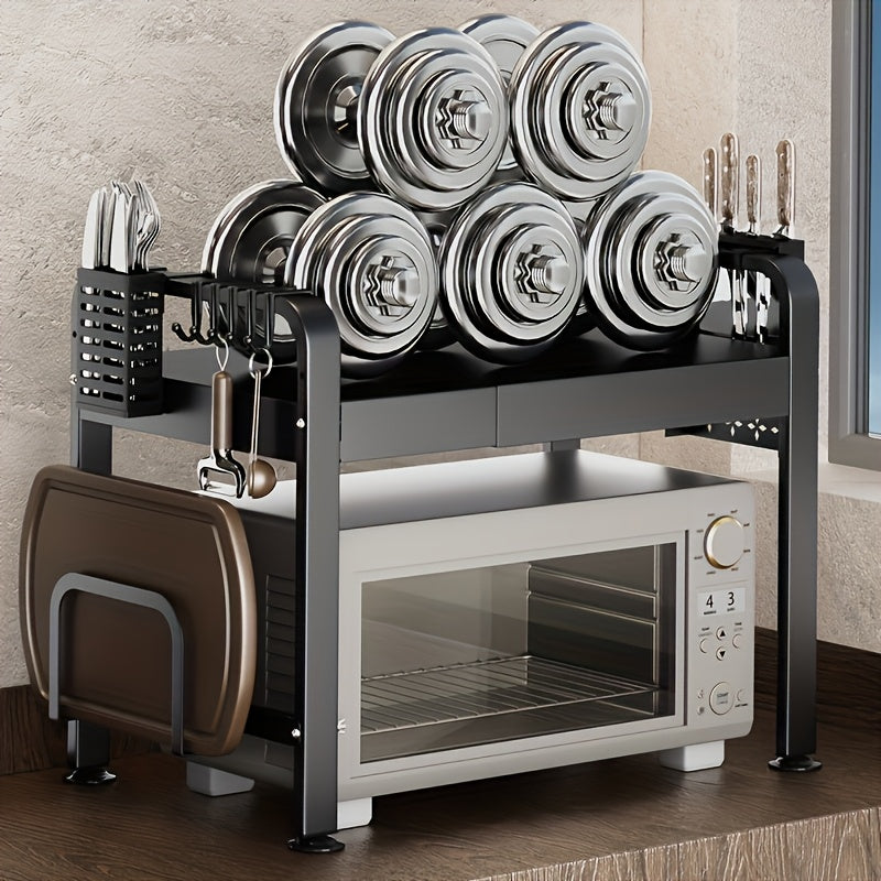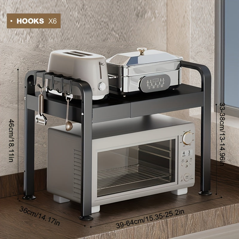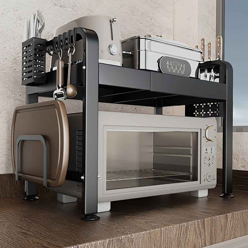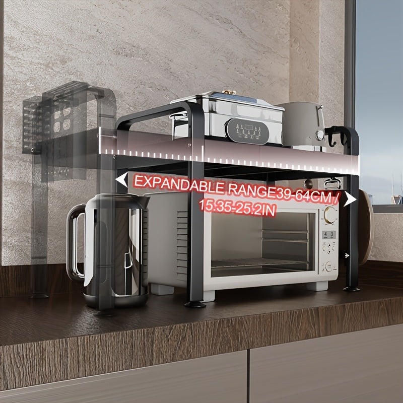 2 Tier Expandable Microwave Oven Rack with Hooks Pot Lid Support Spice Jar Organizer