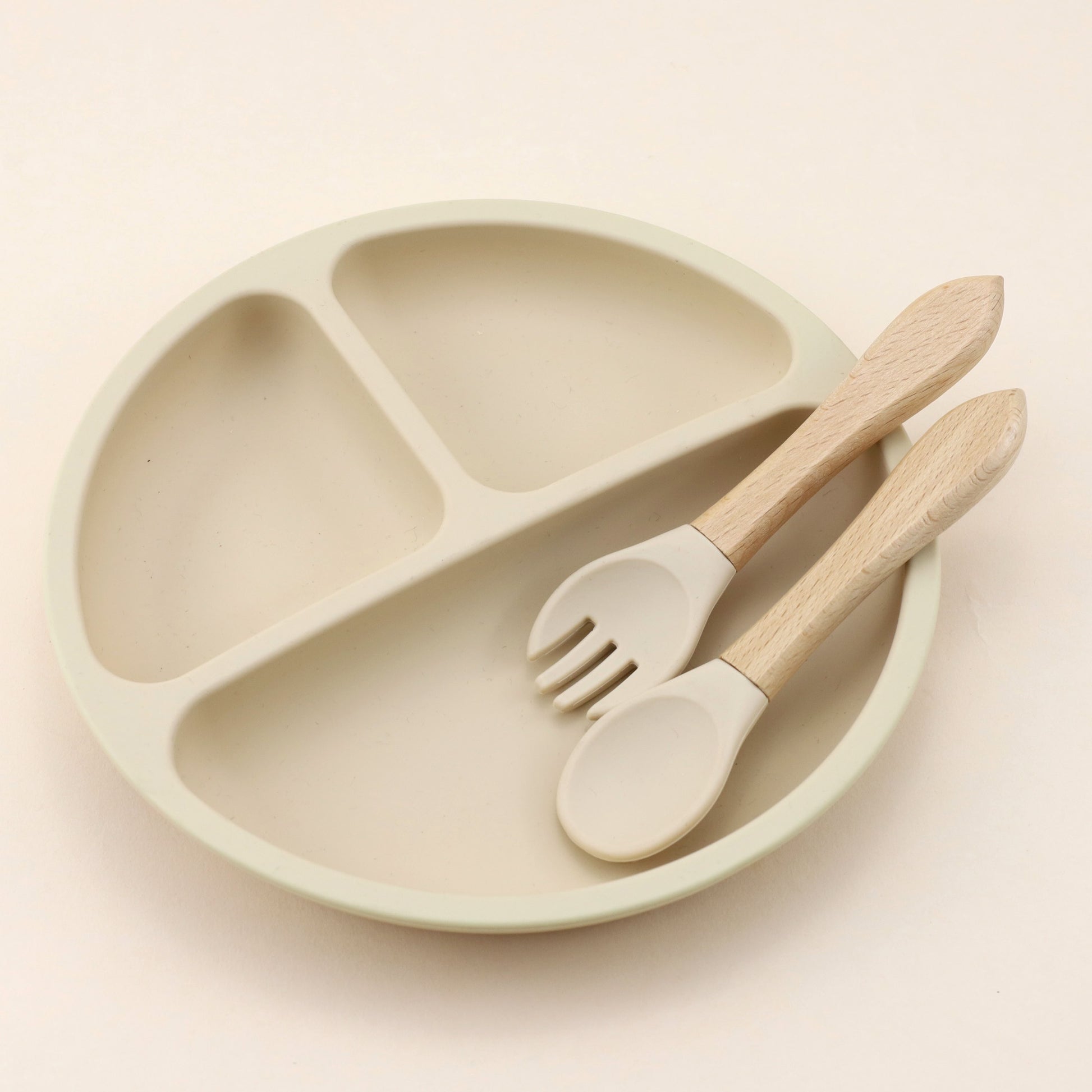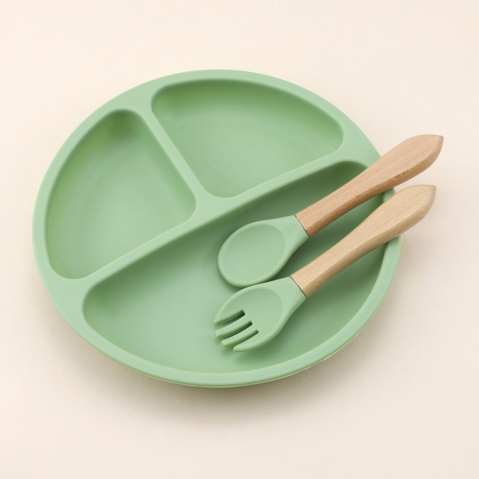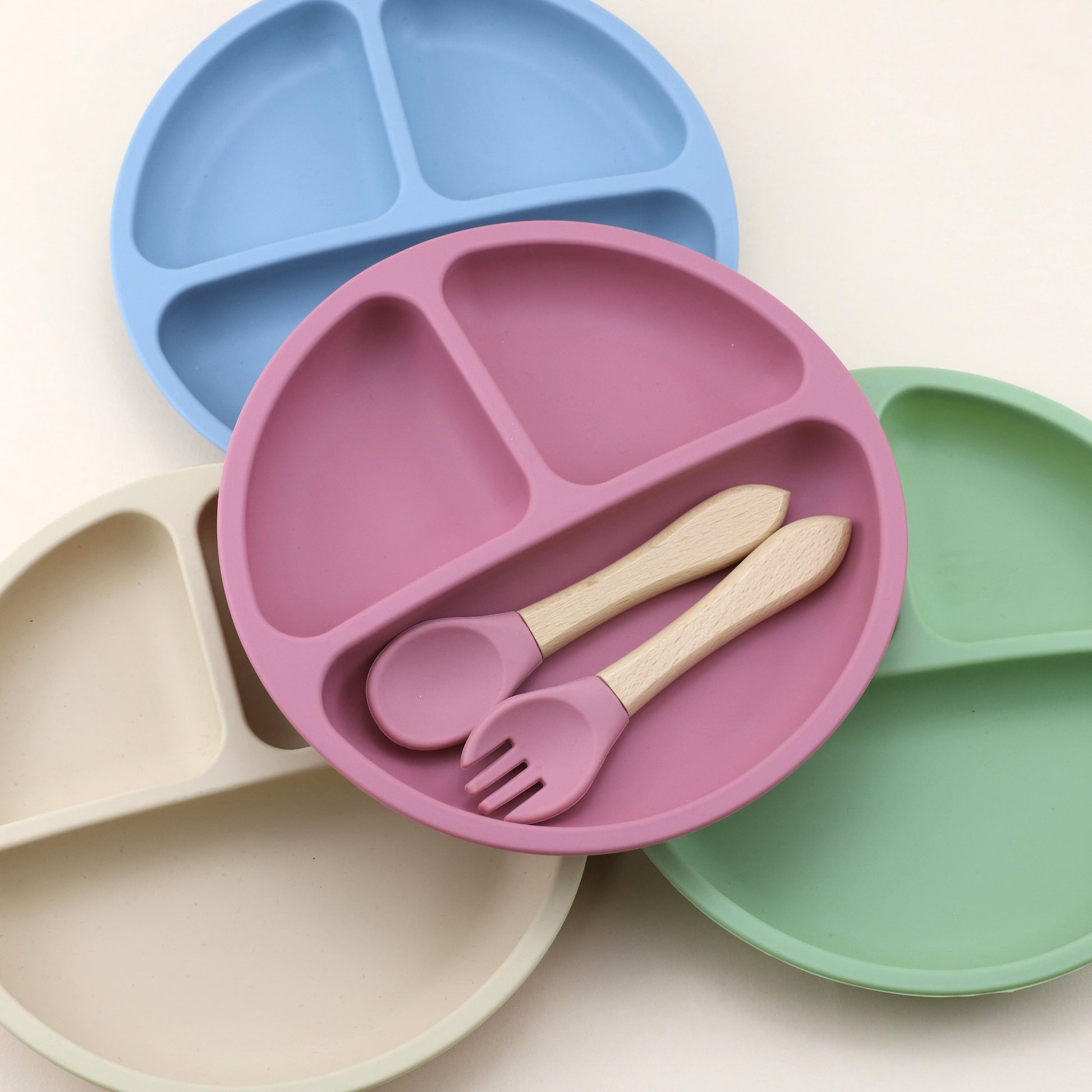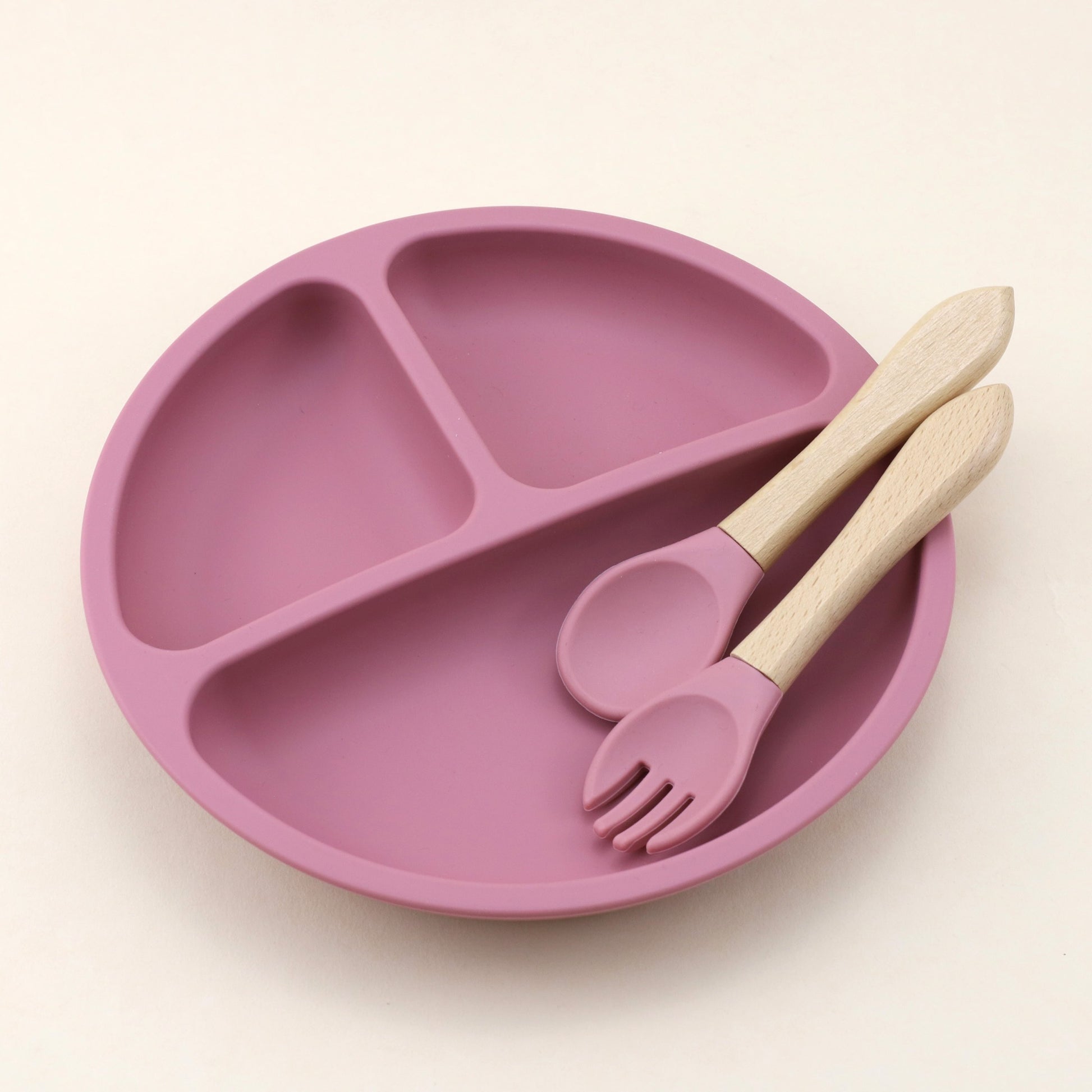 Baby Feeding Set 3-Piece Silicone Divided Plate with Suction Wooden Spoon Fork Red