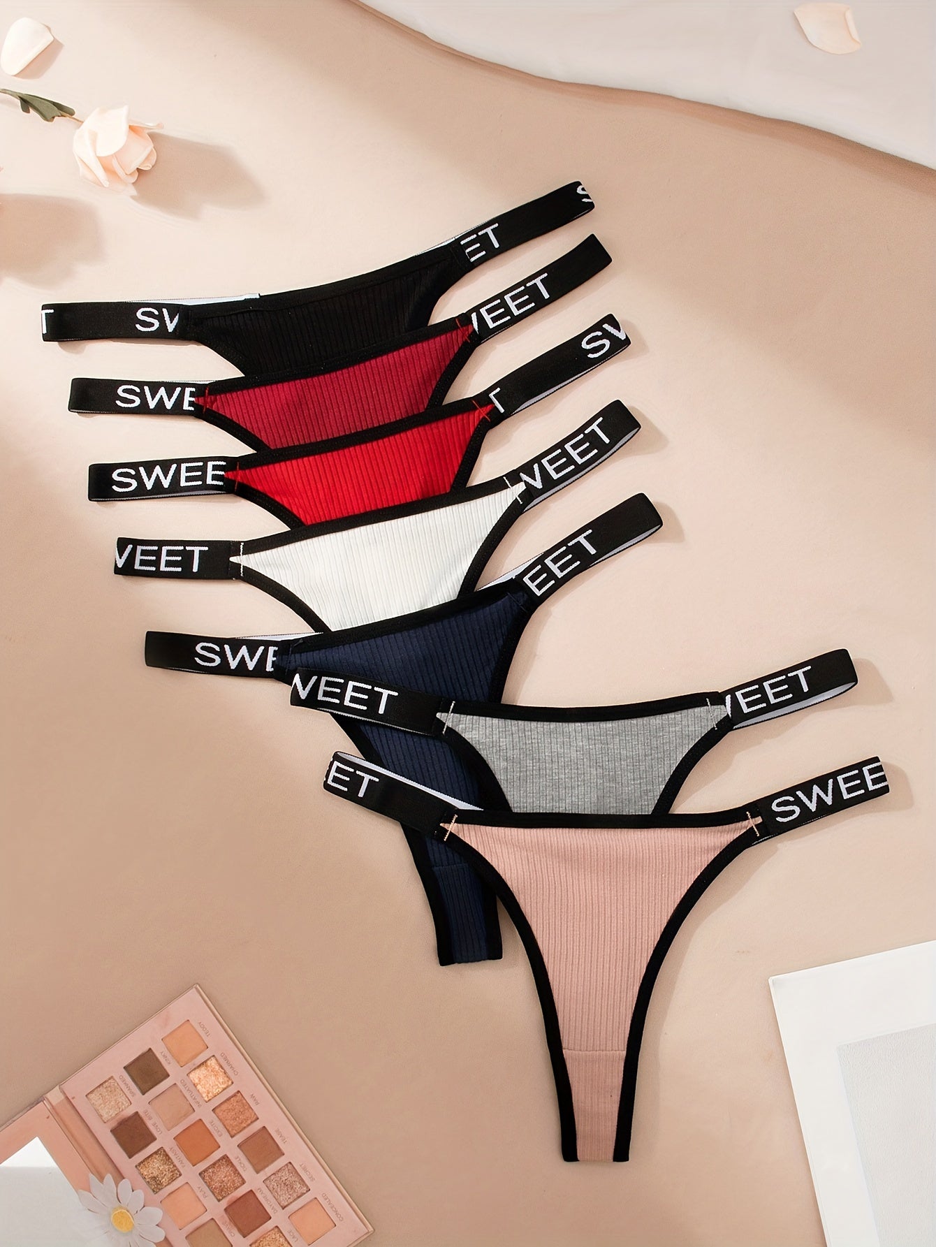 7pcs Women's Letter Tape Contrast Binding Thongs Comfortable Stretch Lingerie