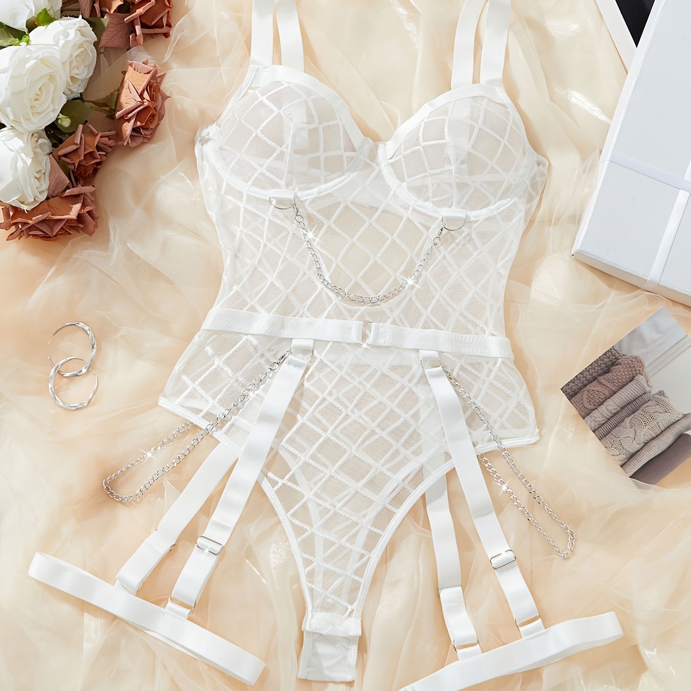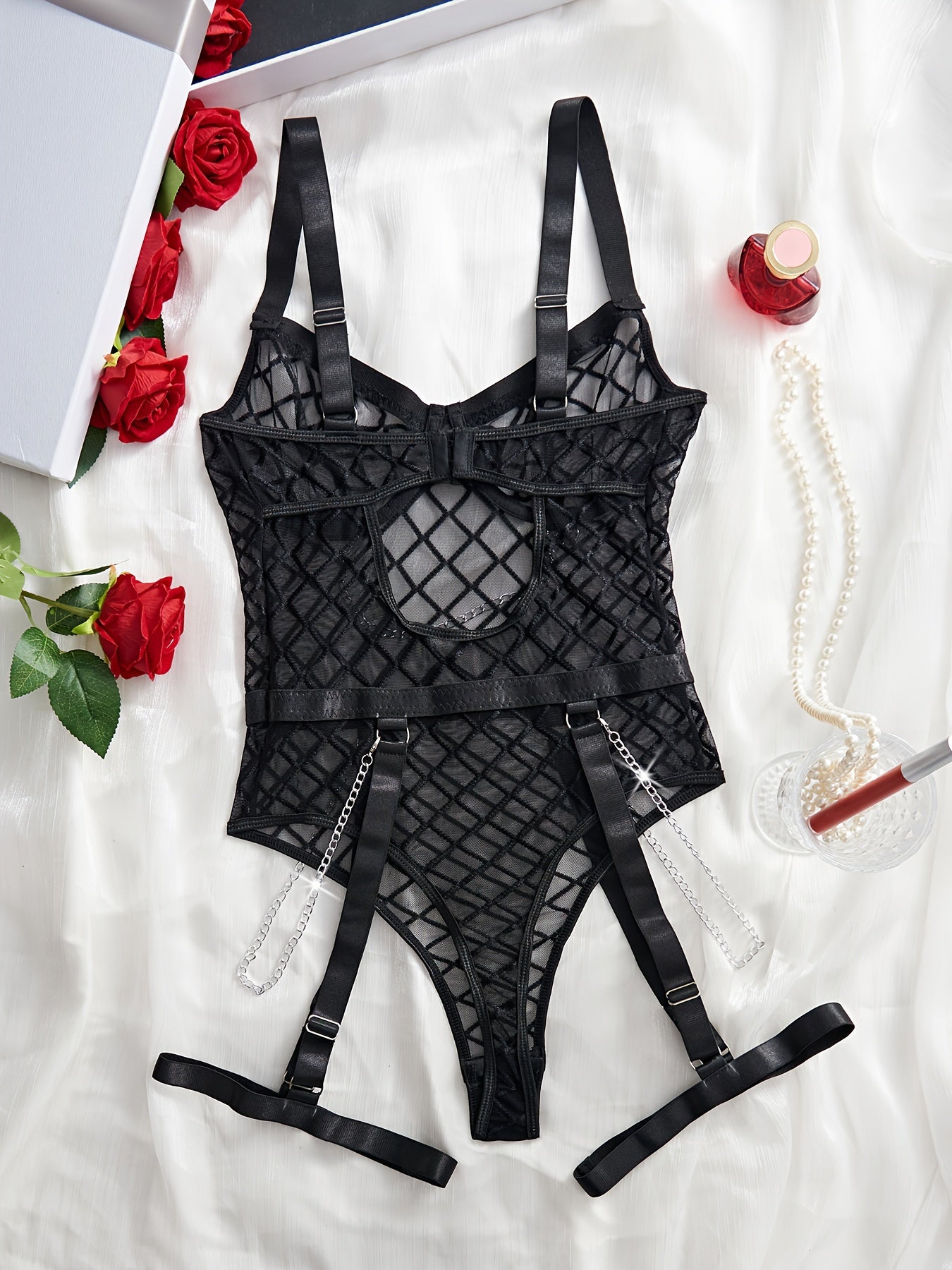 Women's Red Plaid Corset with Chain Details and Lace Trim with Mesh Bodysuit