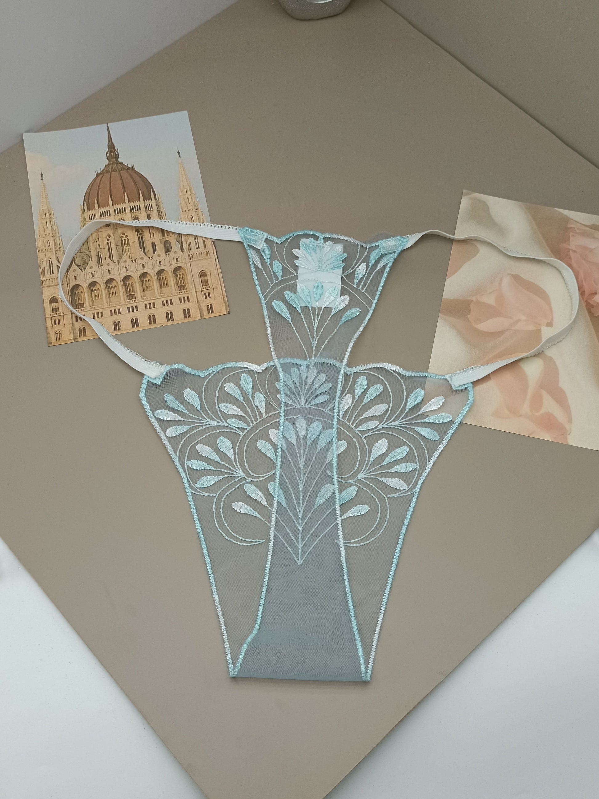 Women’s Blue Transparent Thong Panties with Net Embroidery and Pattern Design
