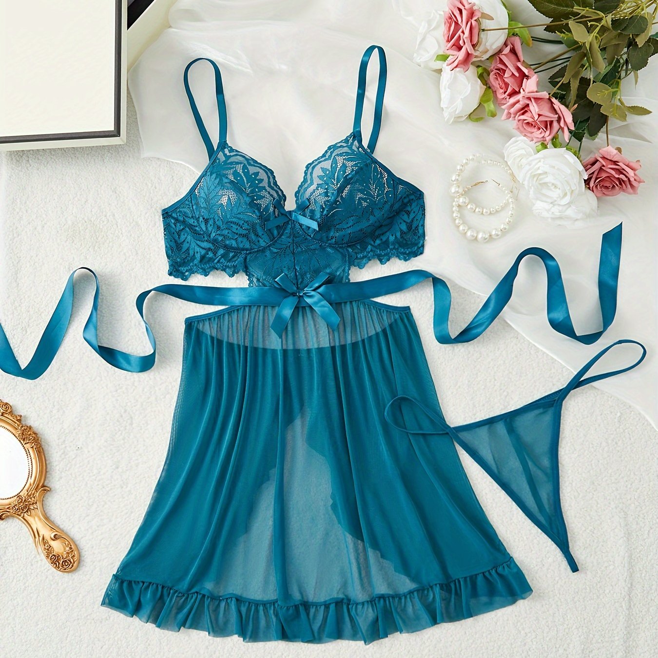Red Lace Bow Tie Lingerie Set with Matching Thong in Burgundy