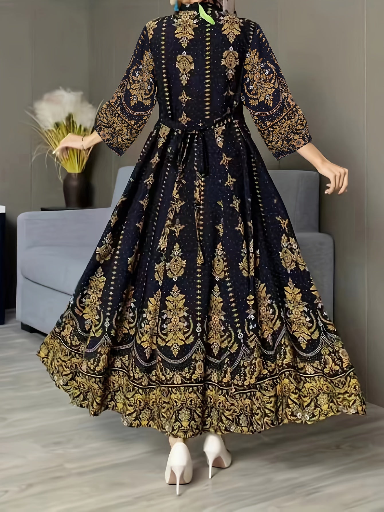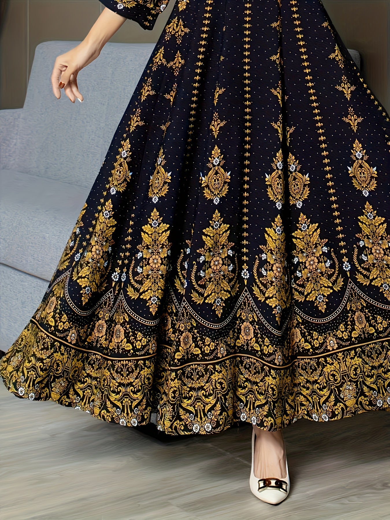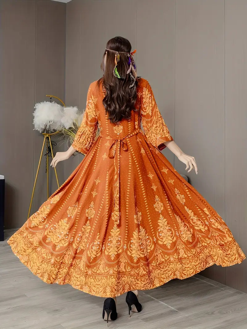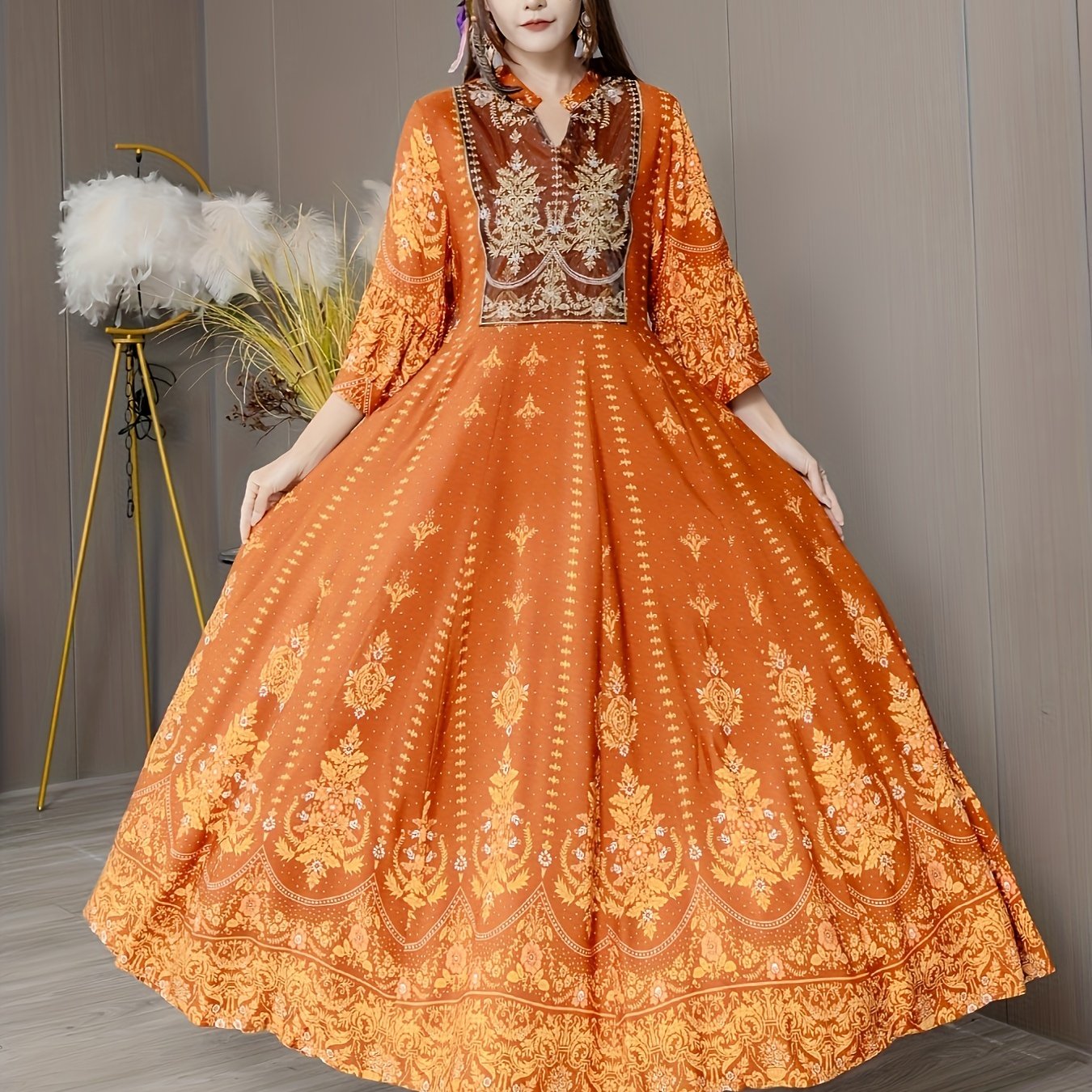 Women's Ethnic Floral Print Maxi Dress with V Neck, 3/4 Sleeves, Woven Polyester for Vacation