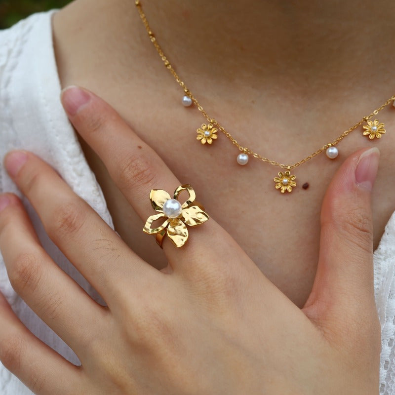 Women’s Titanium Steel Ring with Open Flower Design and Imitation Pearl