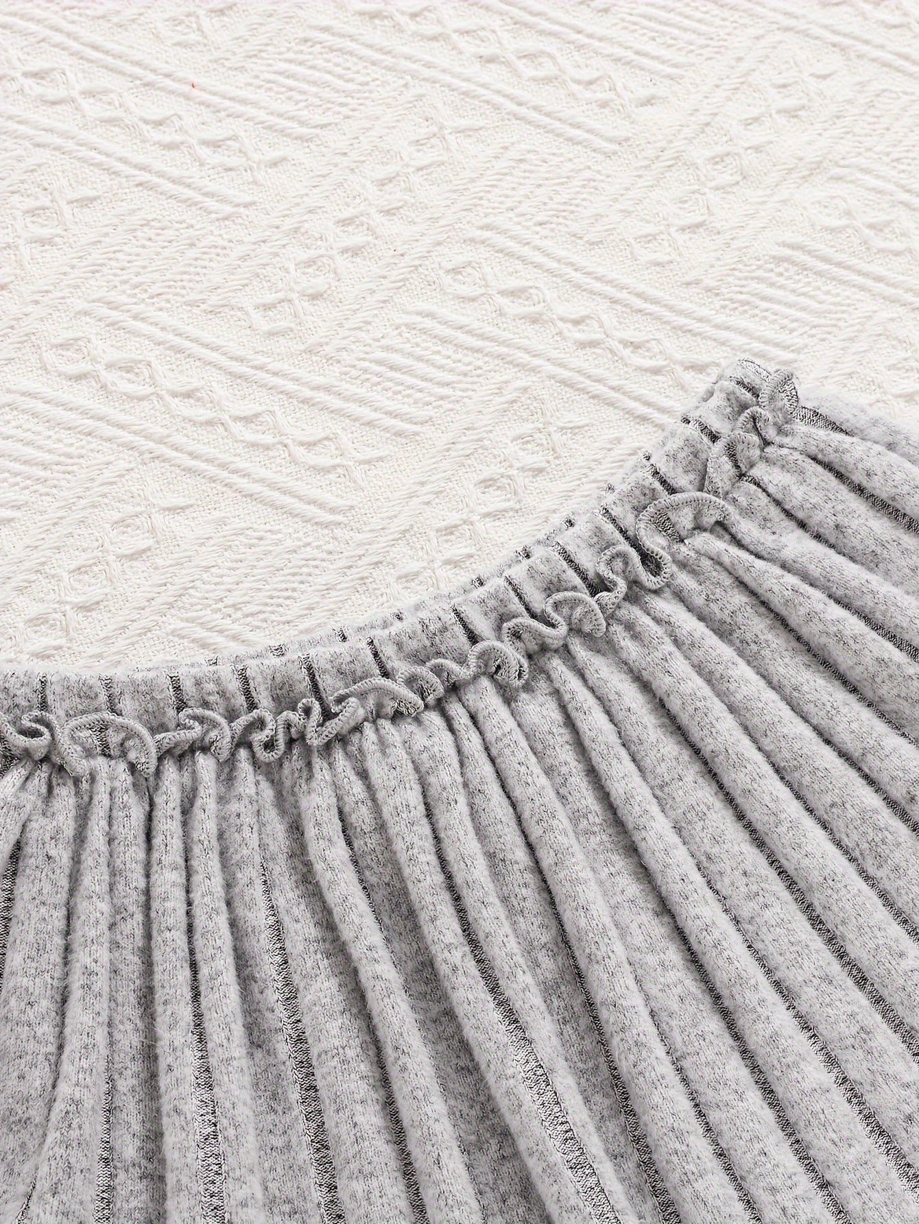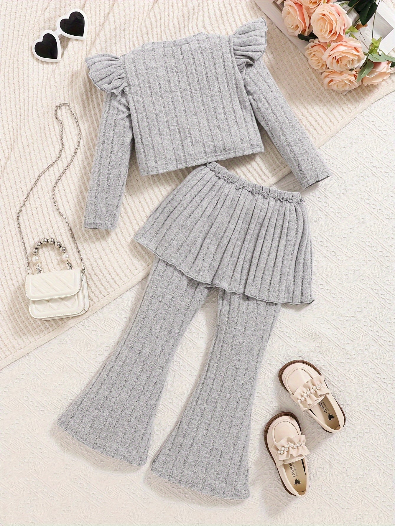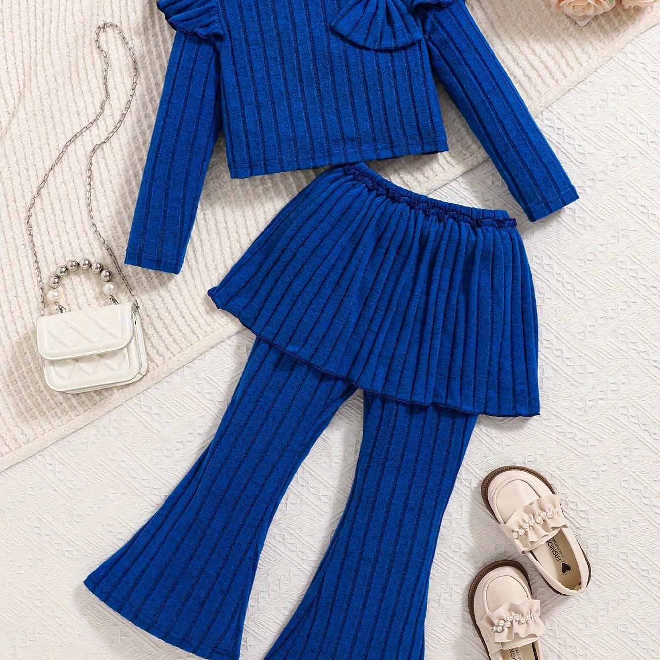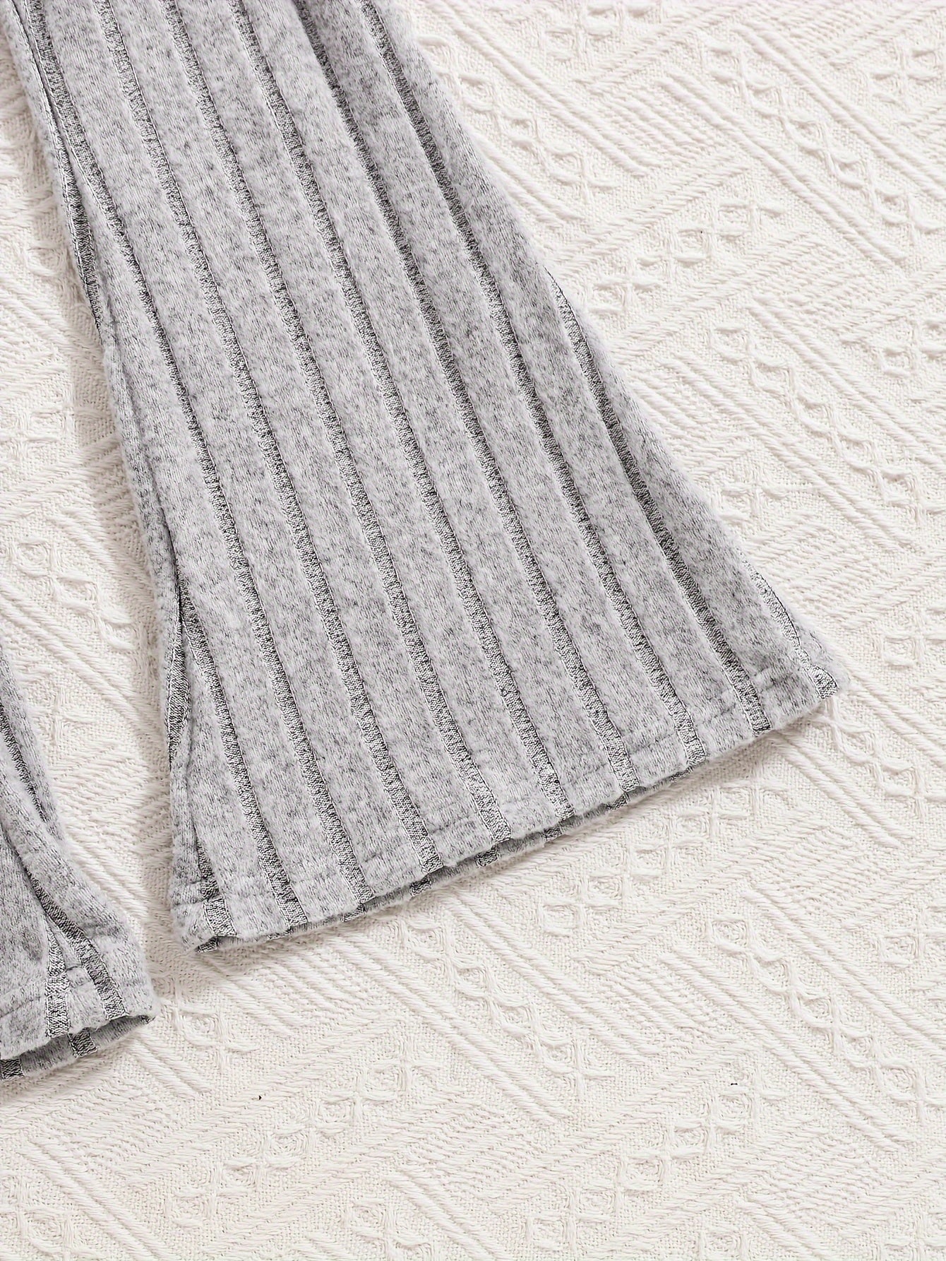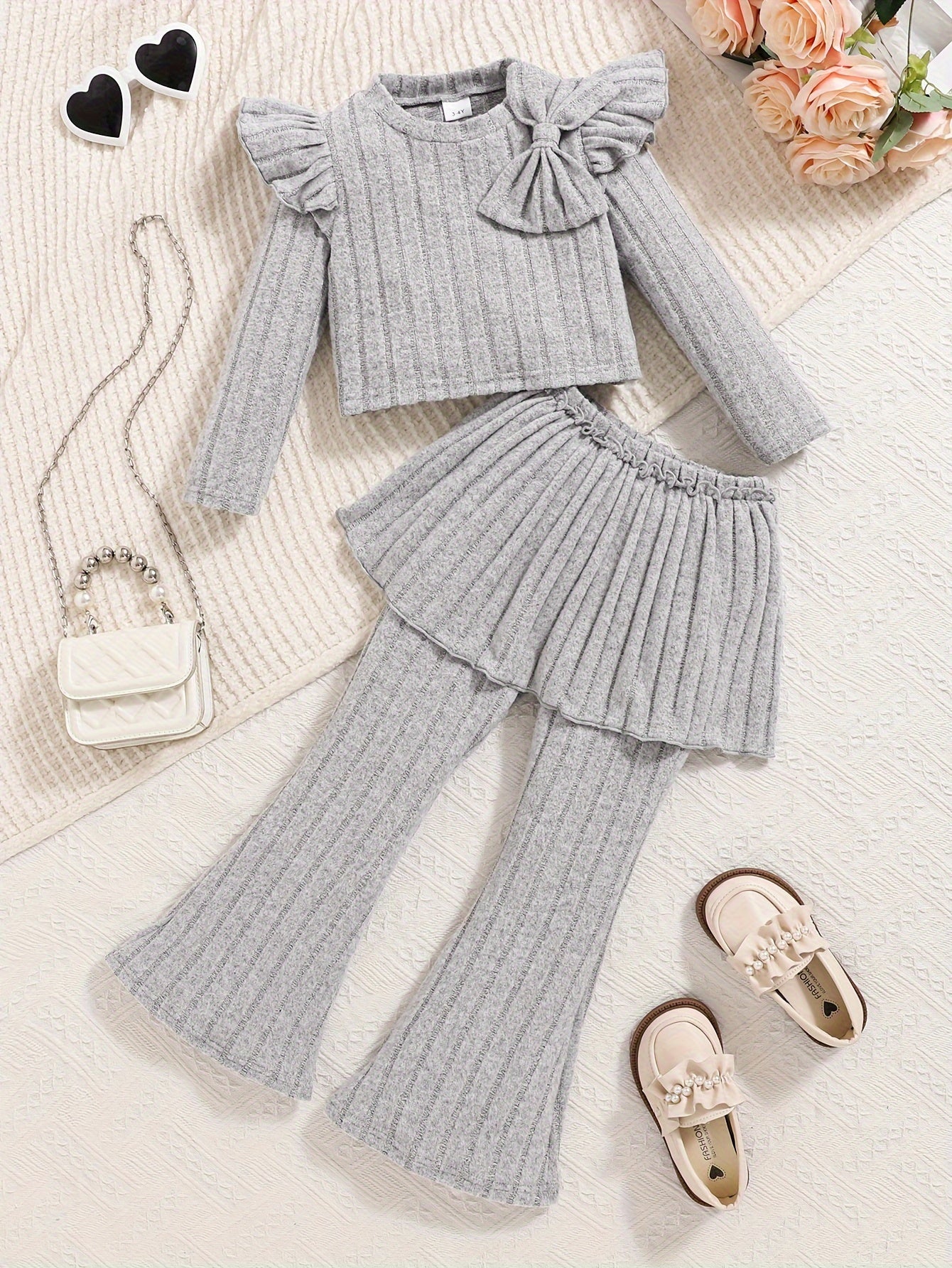 Girls' Fall Winter Solid Color Ribbed Bow Top and Bell-Bottom Pants Set