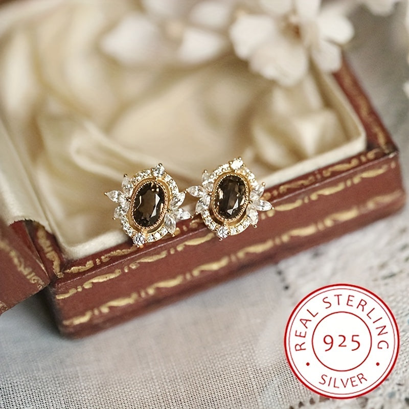 Sterling Silver Stud Earrings for Women with Brown Zirconia Decor