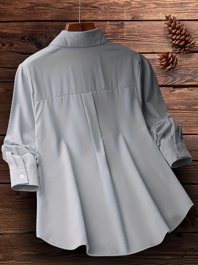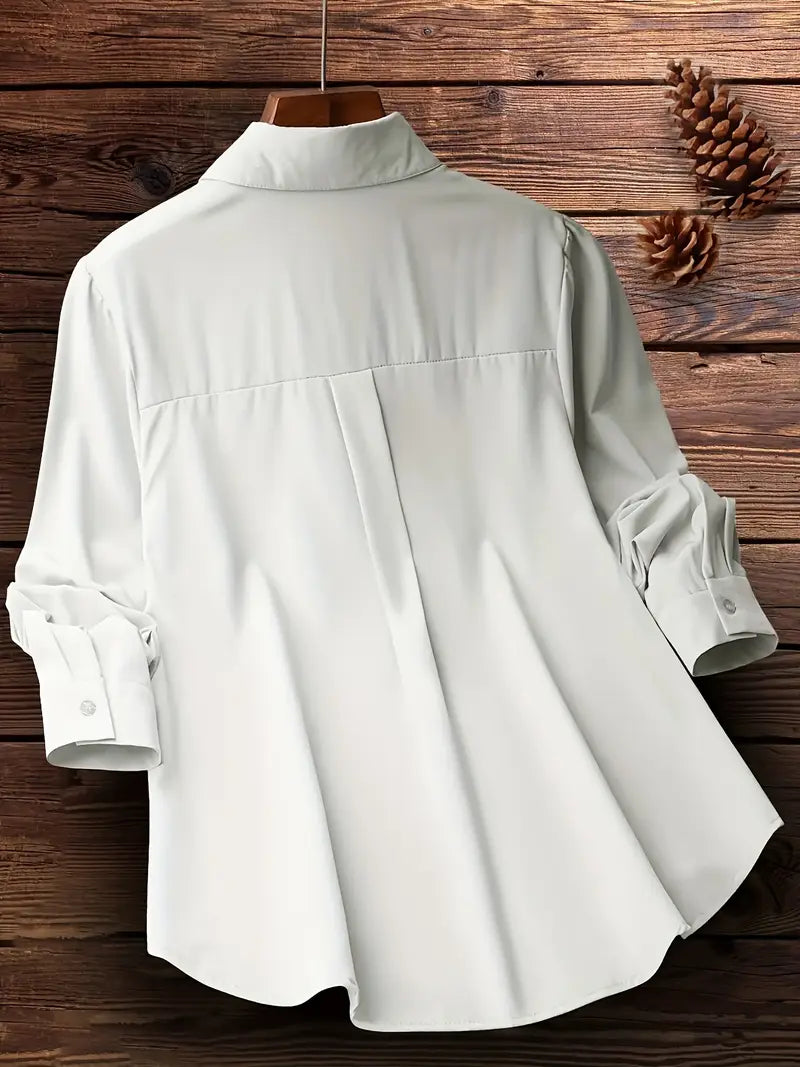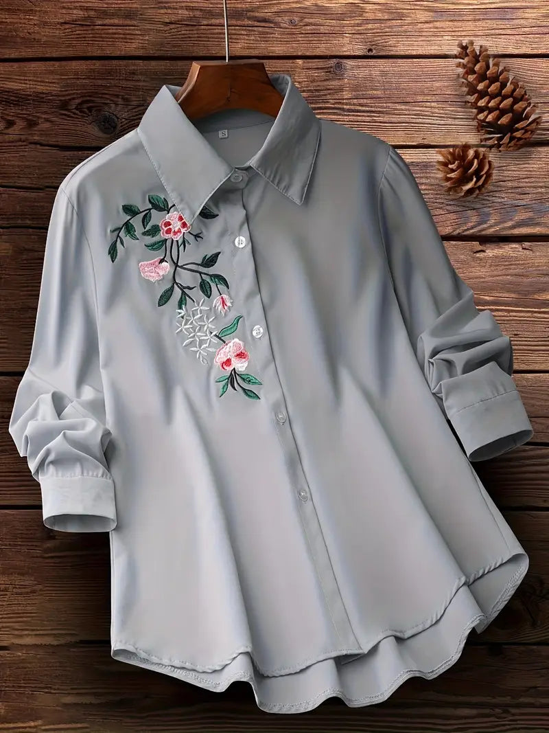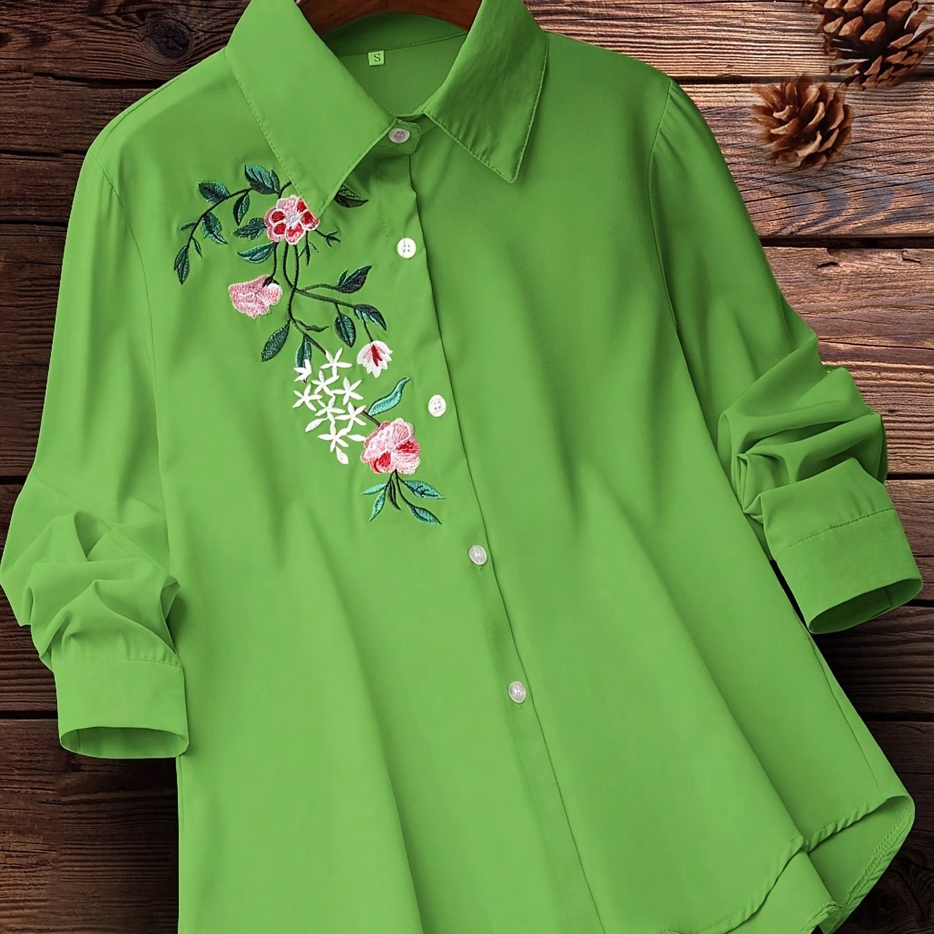 Women's Embroidered Floral Woven Shirt with Lapel Collar for Spring and Fall