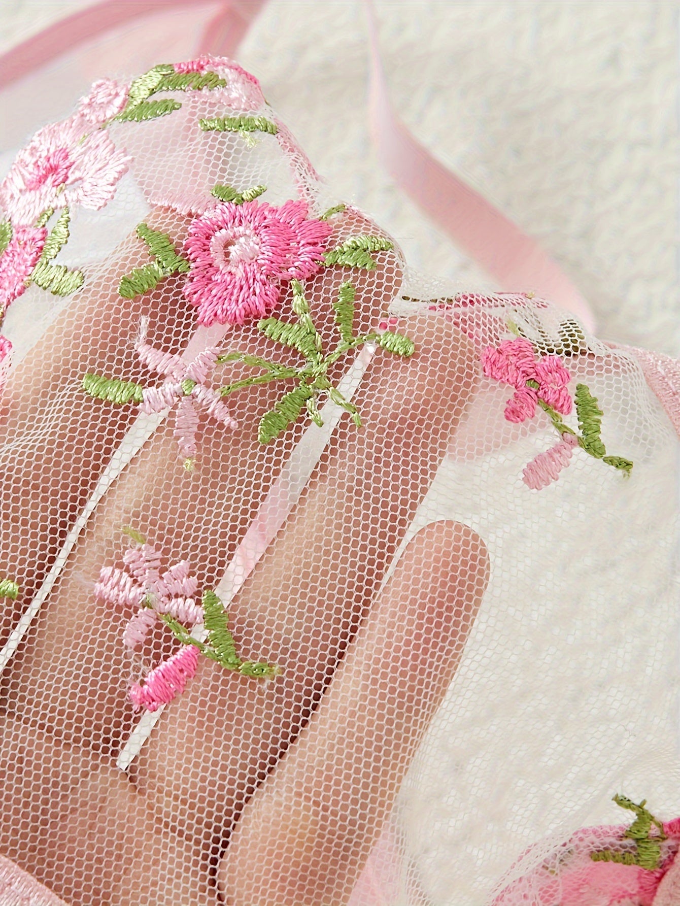 Women's Floral Embroidered Lingerie Set with Semi-Sheer Mesh Bra and Thong