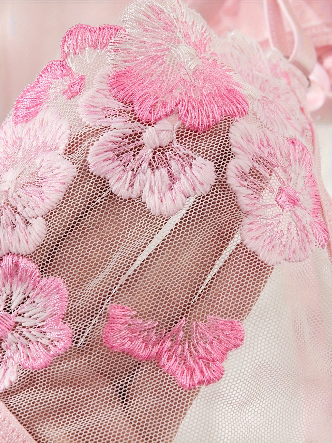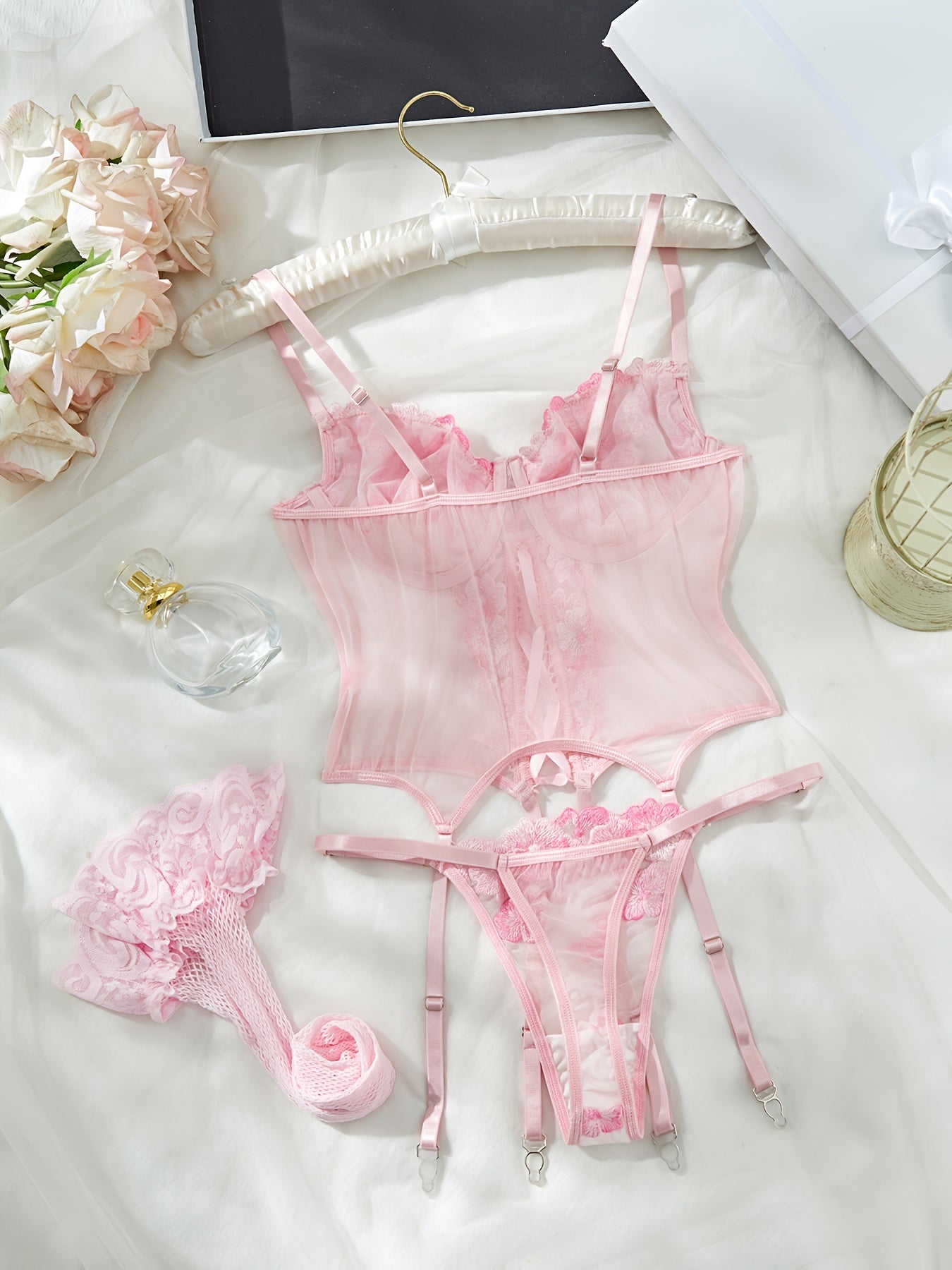 Pink Floral Embroidery Lingerie Set with Garter Belt and Stockings 4-Piece