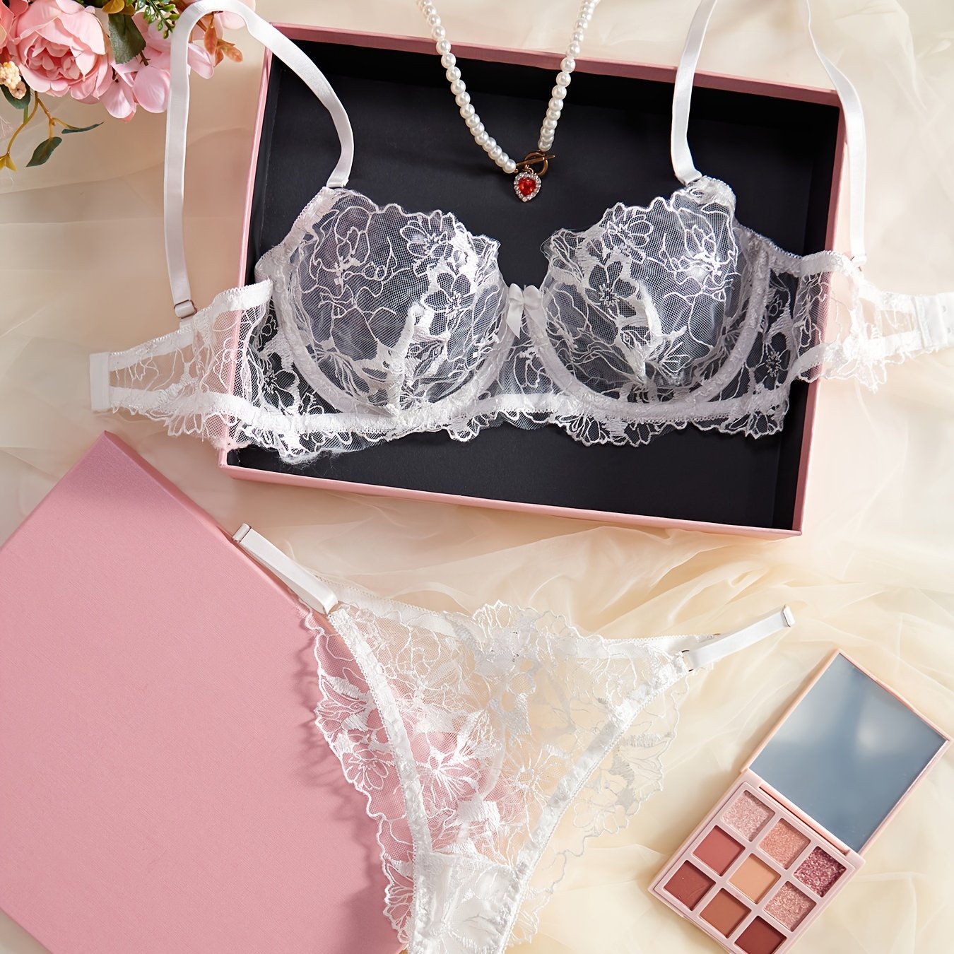 Women's Floral Lace Lingerie Set with Semi-Sheer Bra and Thong