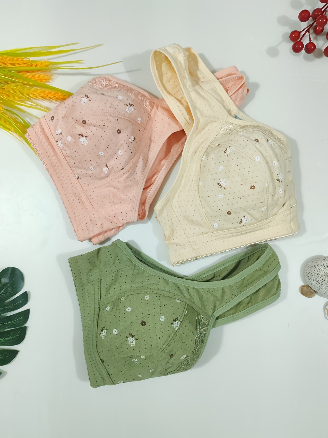 Women's Floral Print Wireless Bra Set with Front Buttons and Adjustable Straps
