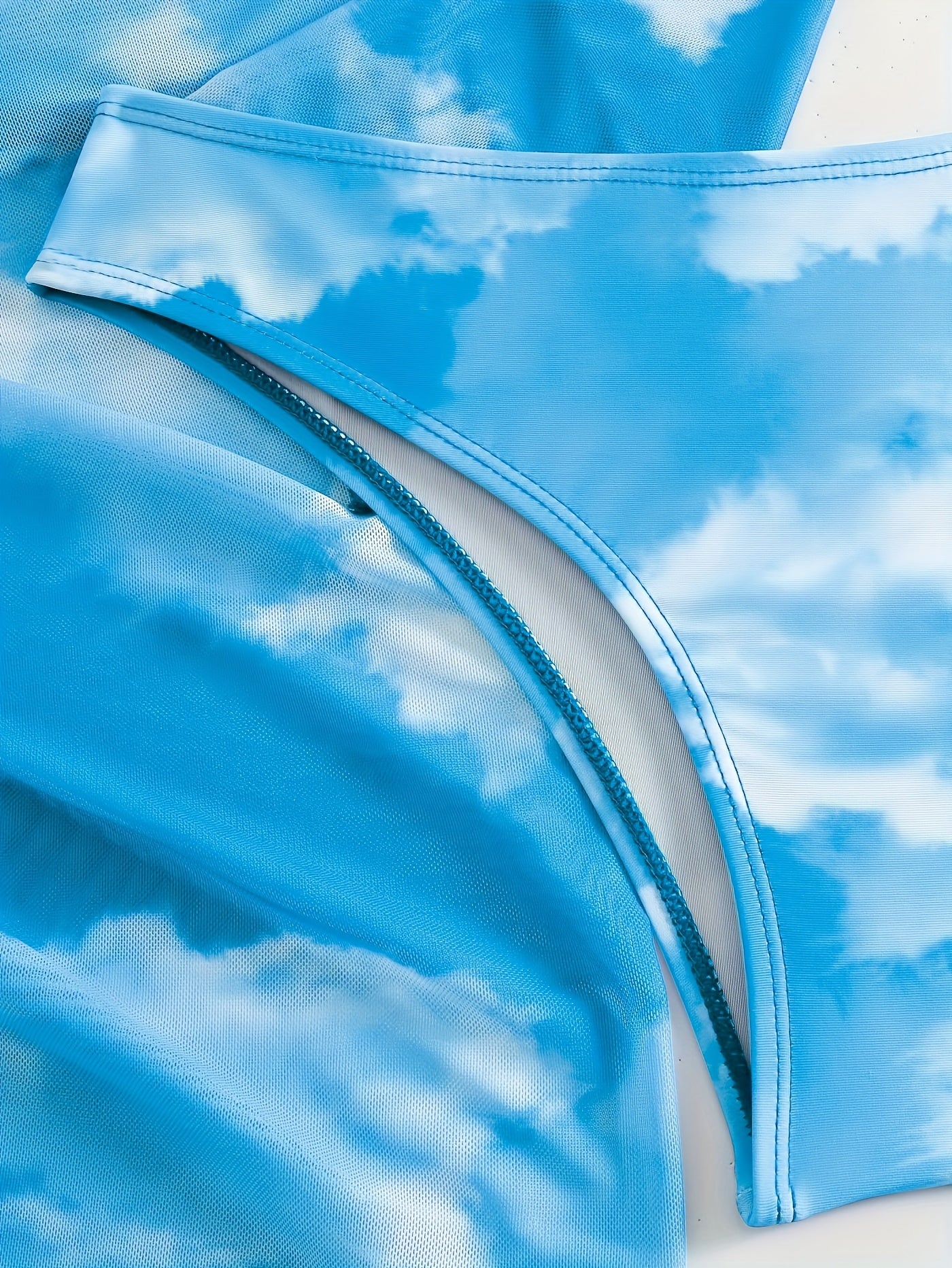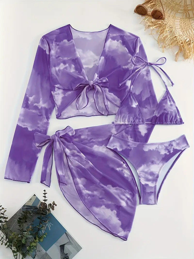 Four-Piece Beach Cover-Up Mesh Wrap Skirt with Halter Neck Bikini and Printed Design