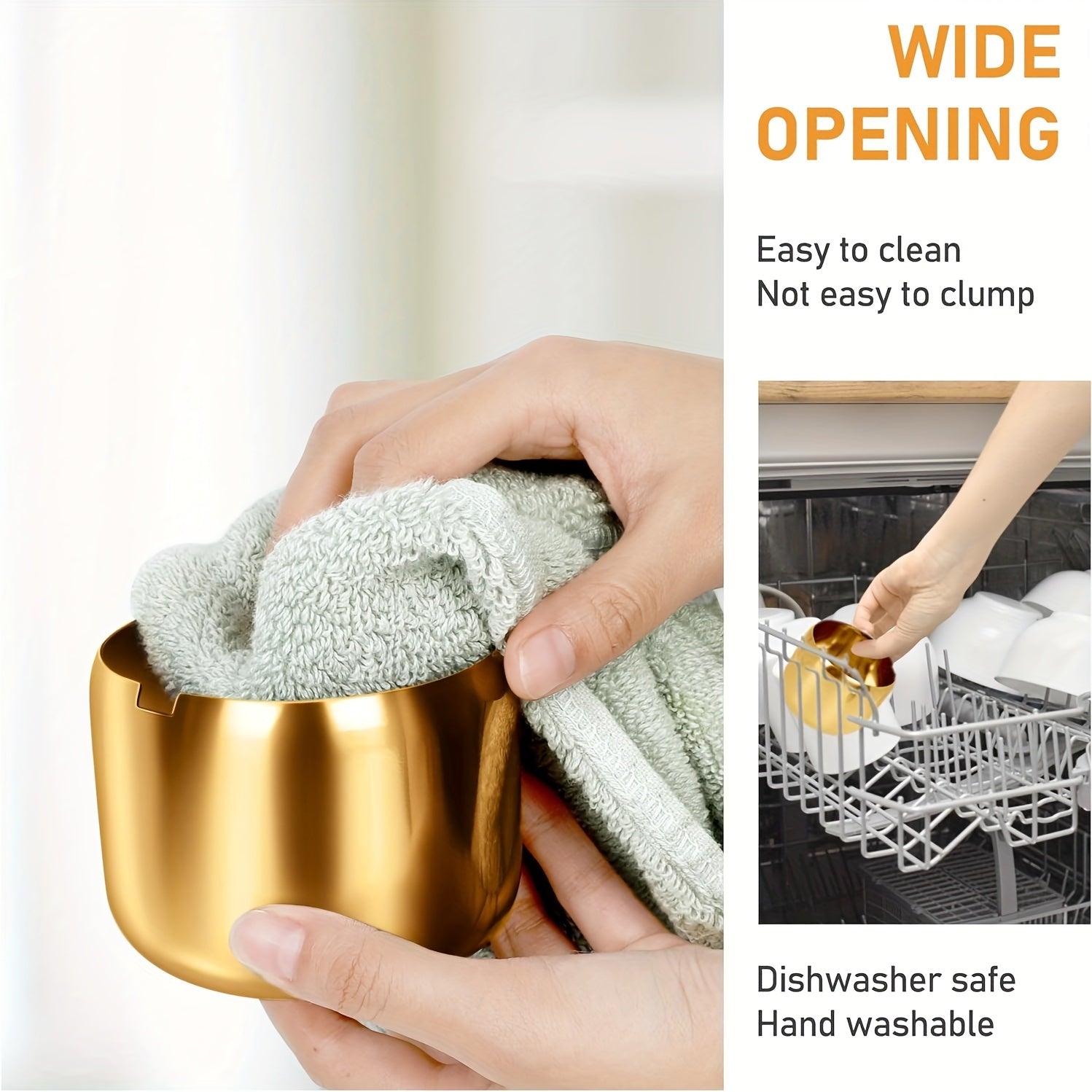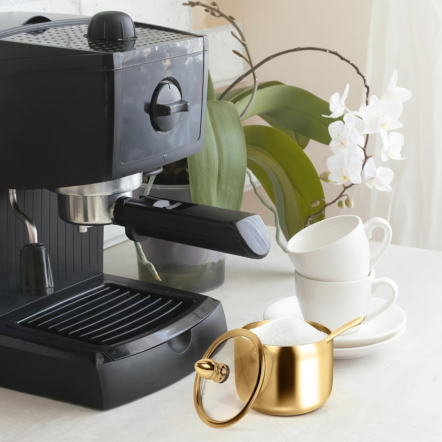 Golden Stainless Steel Sugar Bowl with Glass Lid and Spoon Dishwasher Safe Kitchen Storage