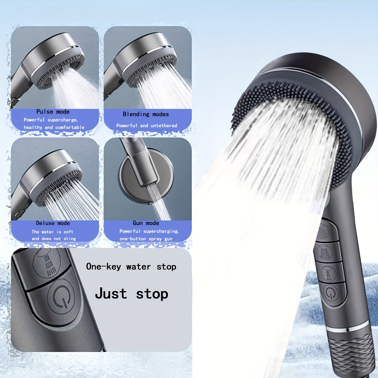 High-Pressure Handheld Shower Head with 5 Modes Stainless Steel Hose Adjustable Bracket