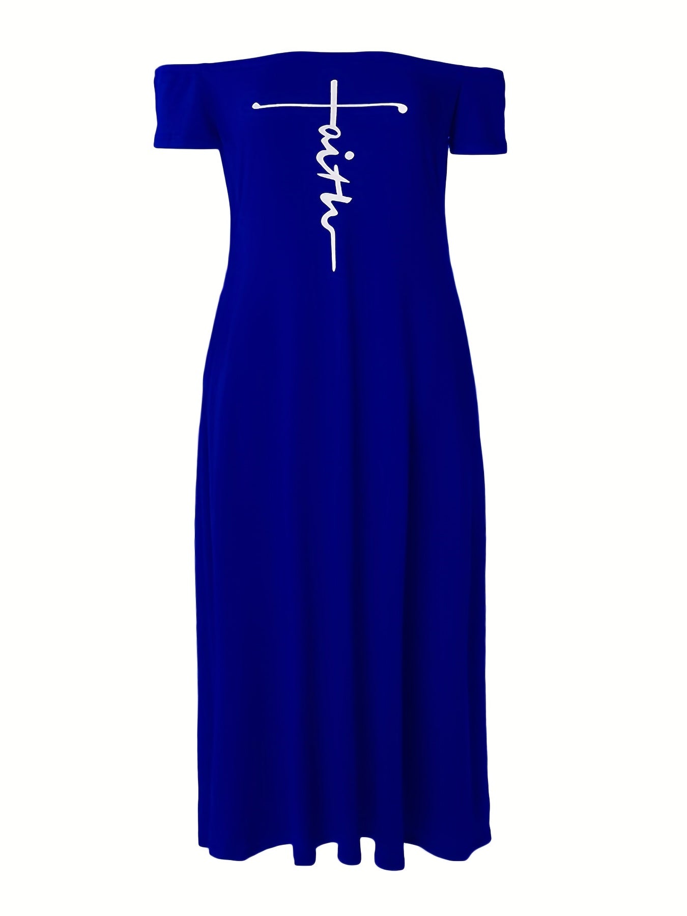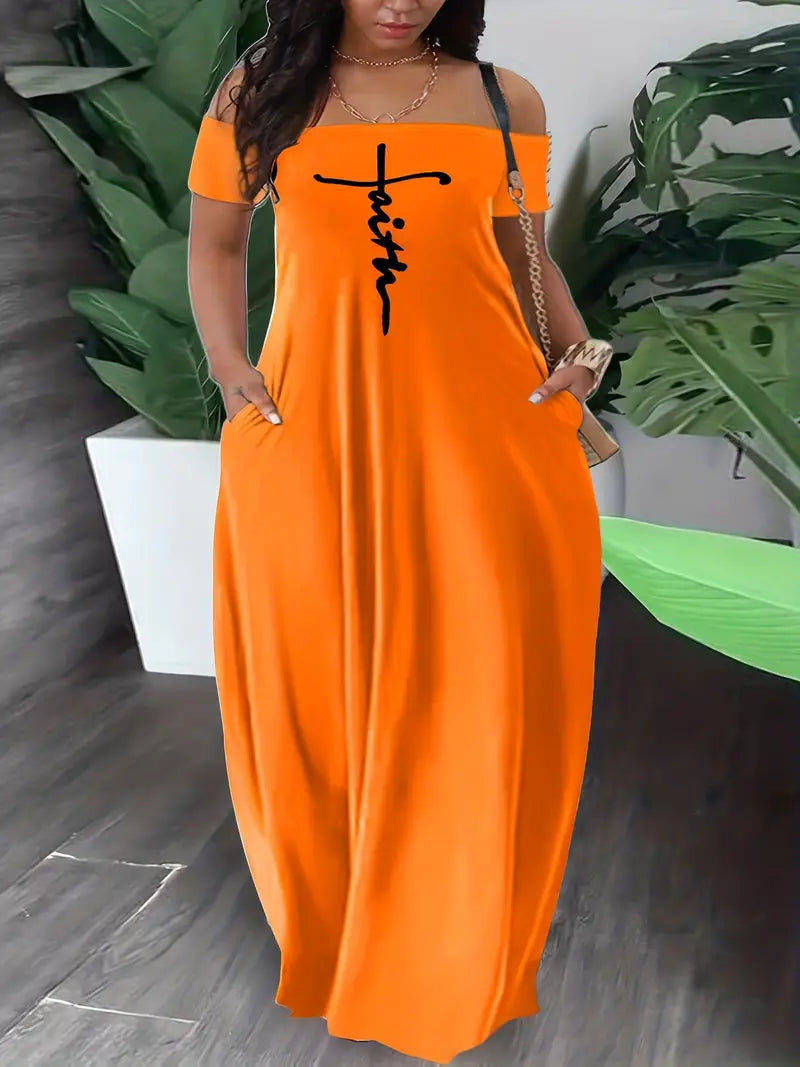Plus Size Off-Shoulder Maxi Dress with Pockets and Cross Letter Print