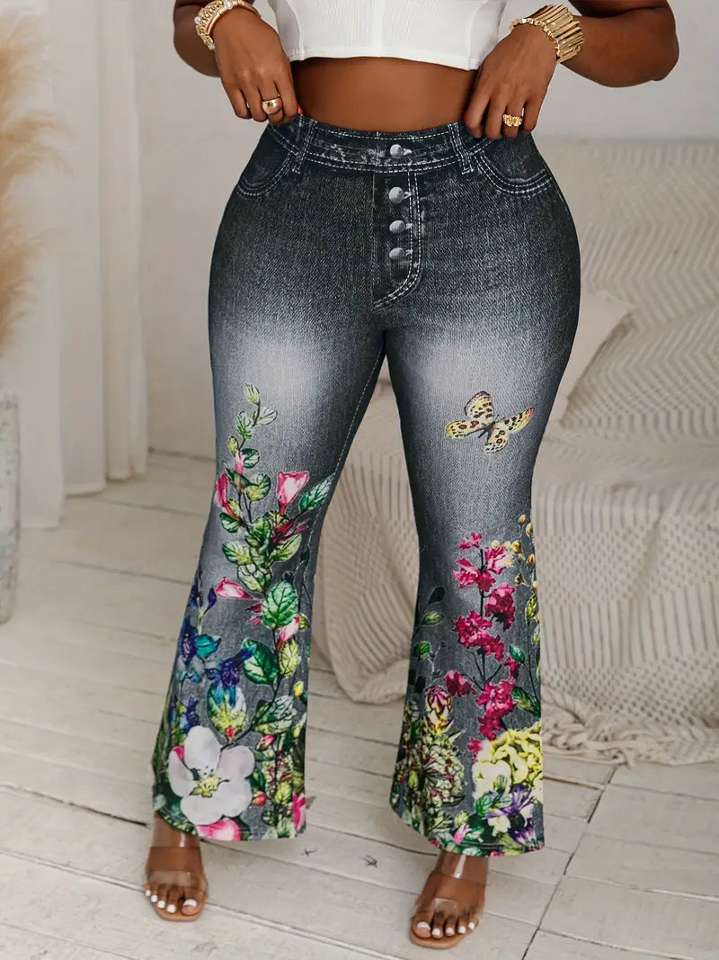 Plus Size Faux Denim Floral Print Flared Leg Pants High Waist Summer Womens