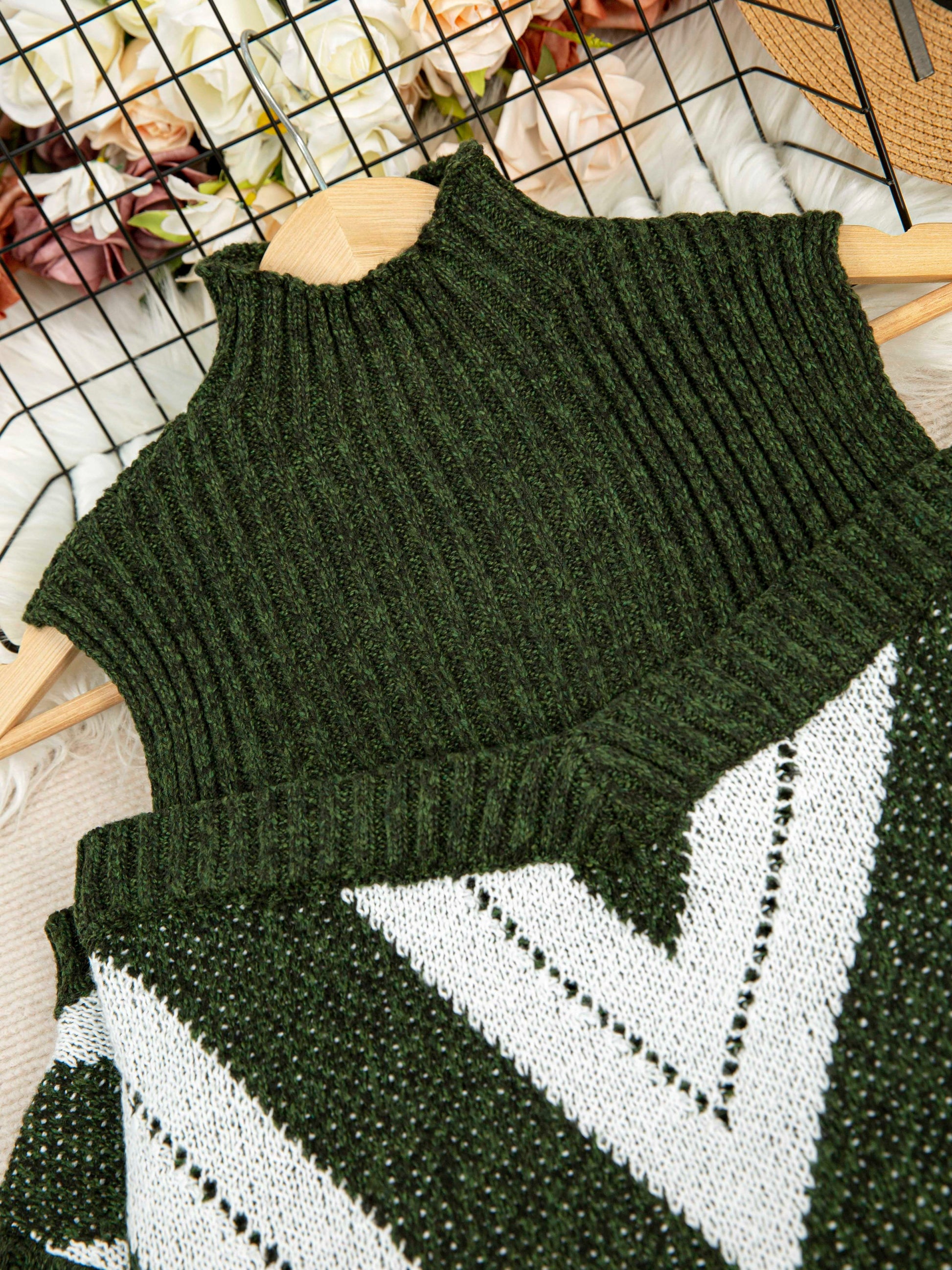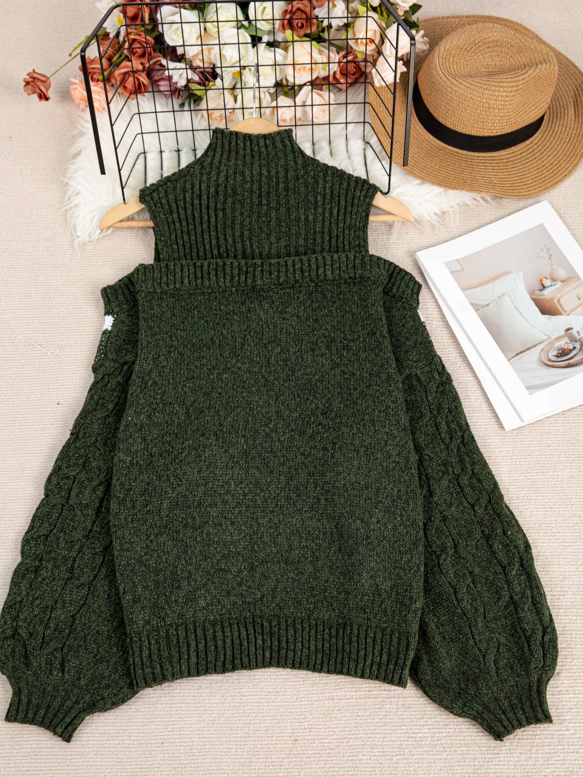 Plus Size Off-Shoulder High Neck Cable Sweater Striped Grey White Pullover
