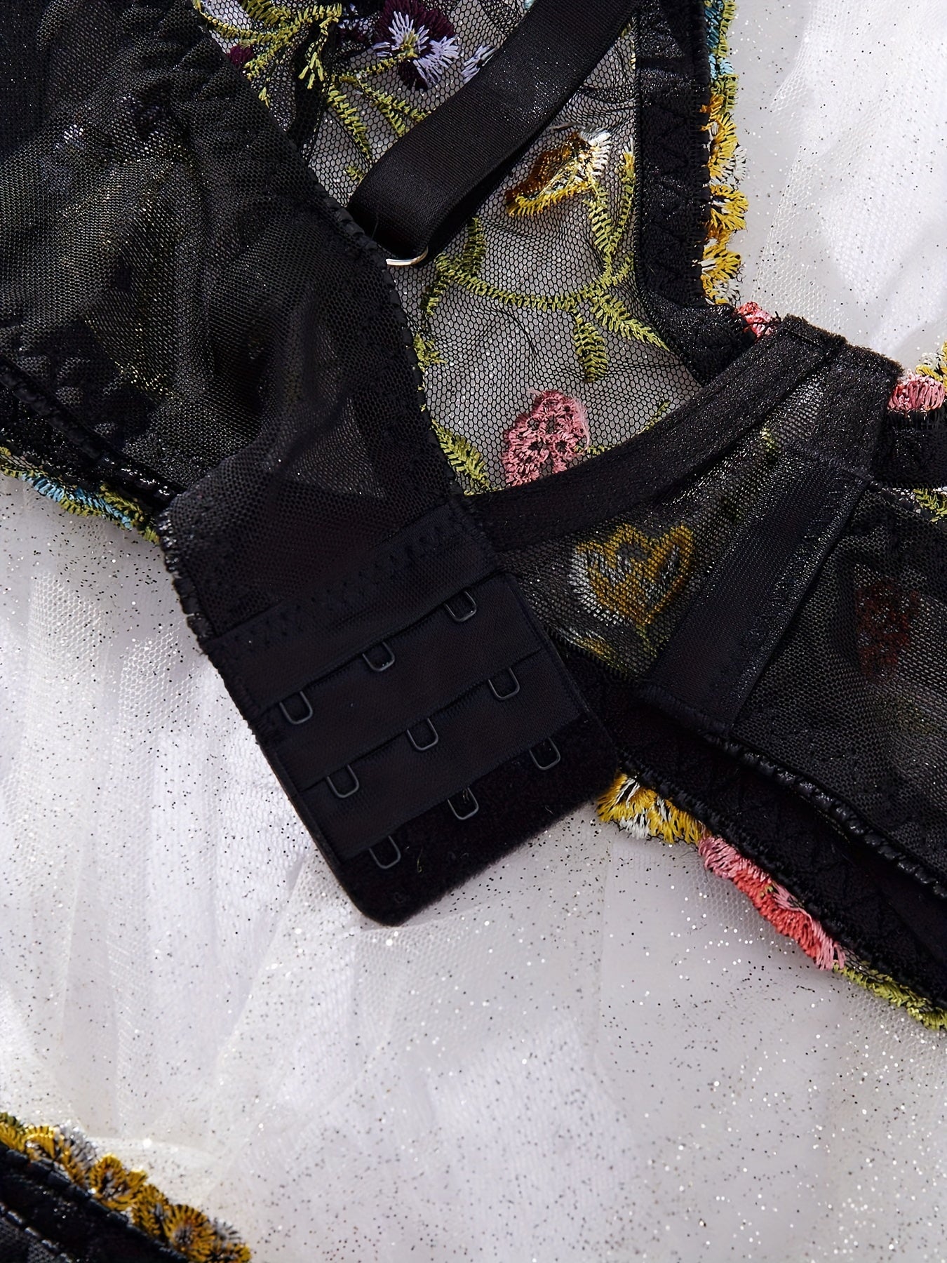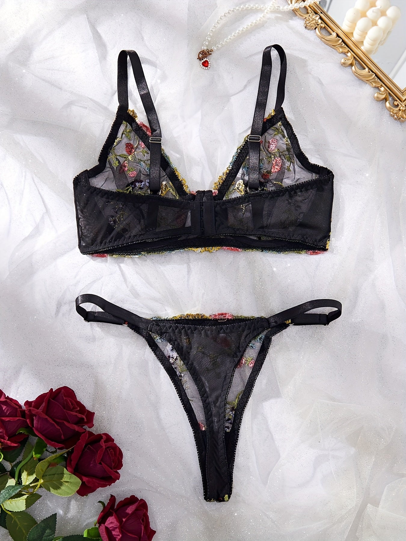 Plus Size Sexy Lingerie Set Floral Embroidery Sheer Mesh Bra and Thong
