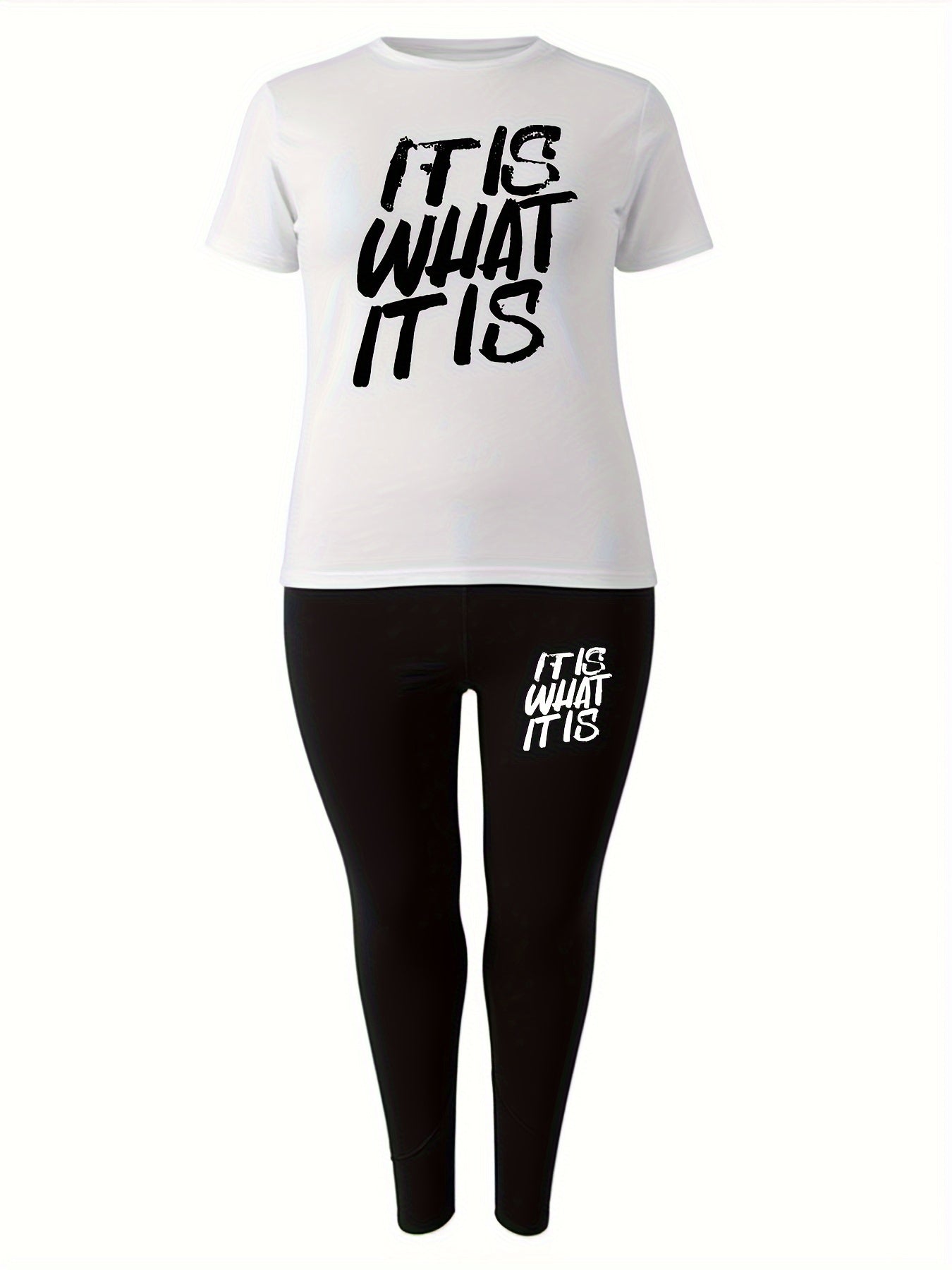 Plus Size Slogan Print Sports Set with Medium Stretch Polyester Knit Fabric