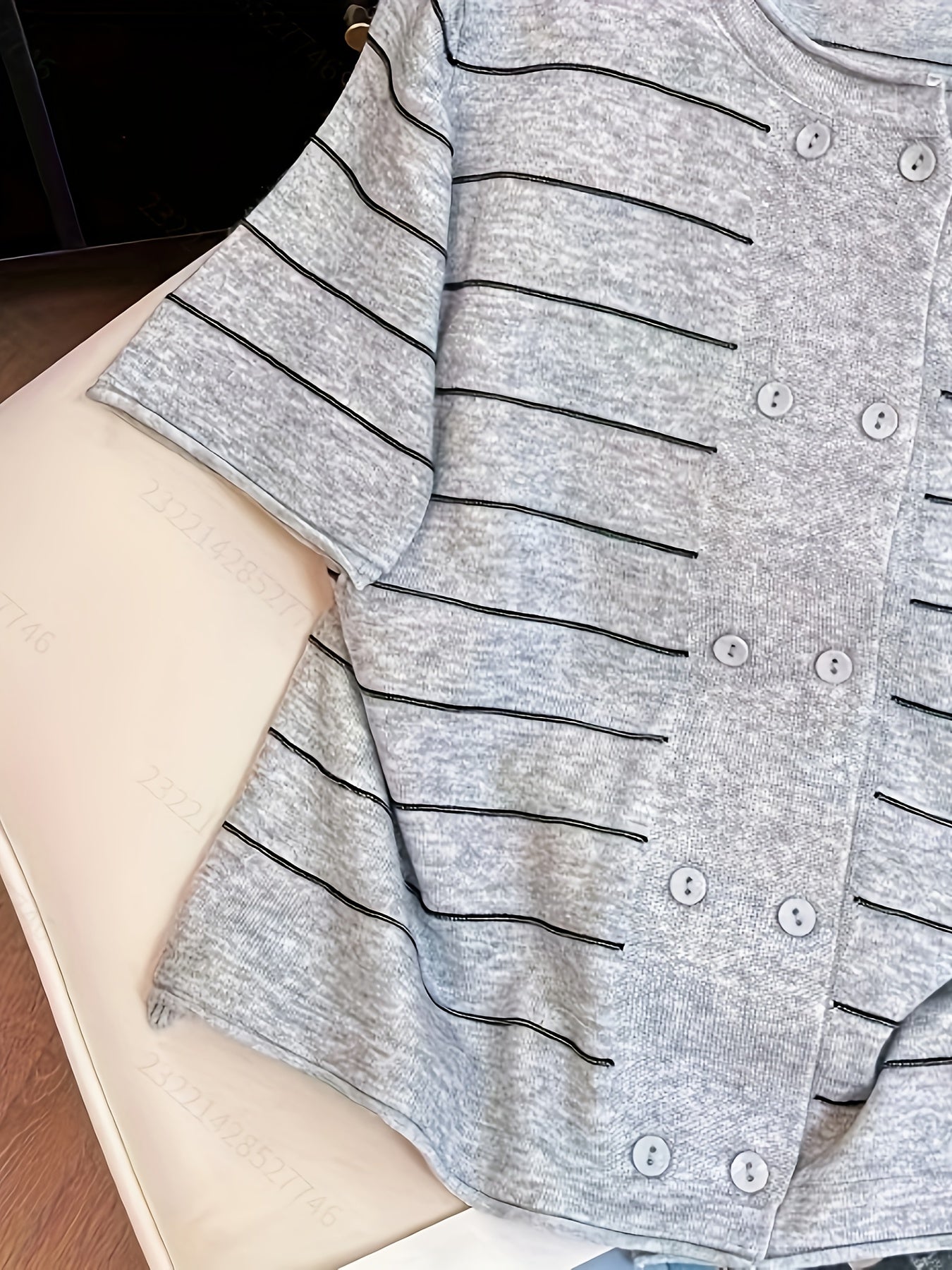 Plus Size Women's Striped Cardigan Light Gray White Short Sleeve Casual Top