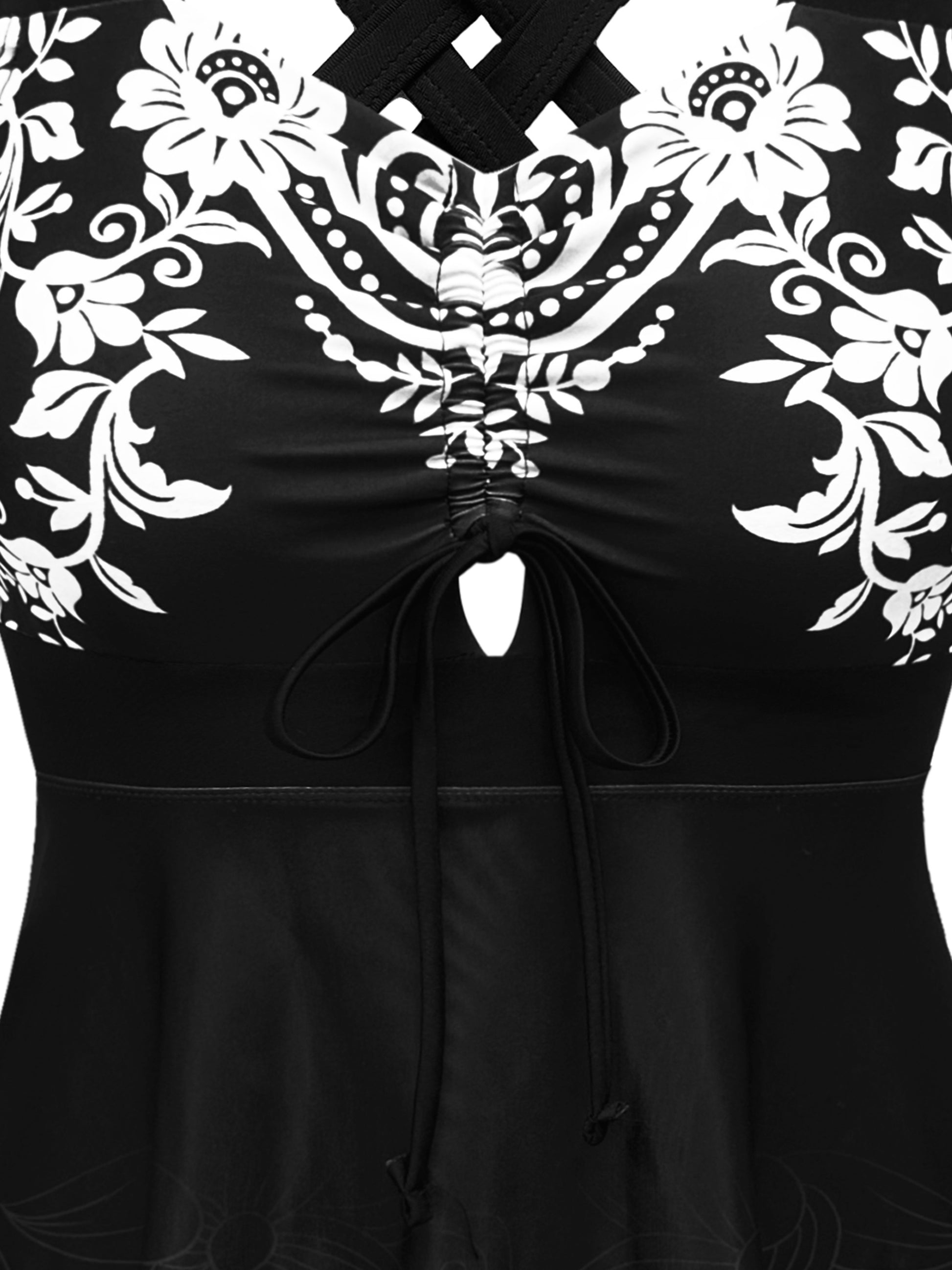 European American Floral Swimsuit for Women with Pleated Edges Polyester Elastane Two-Piece