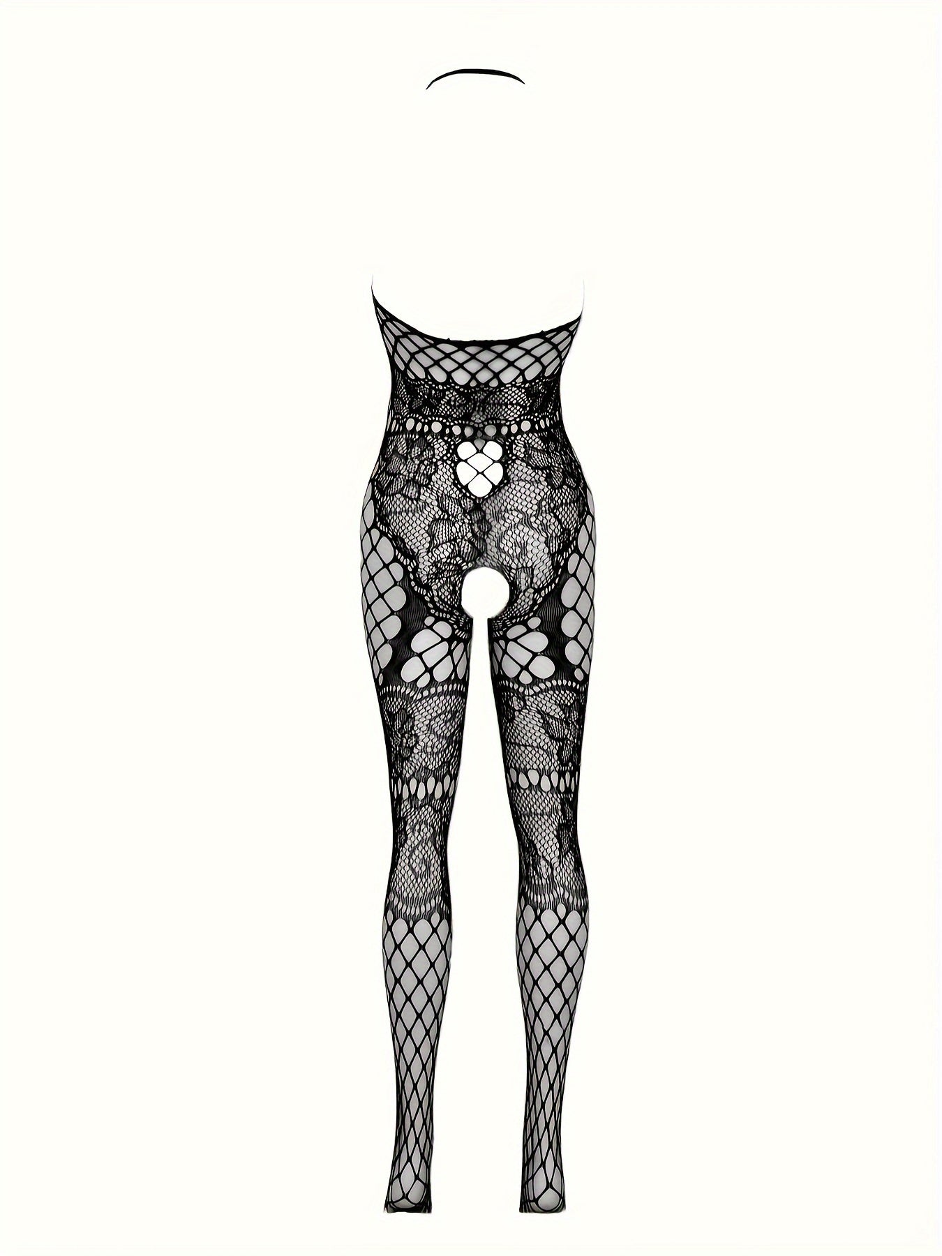 Women's Fishnet Bodysuit with Crotchless Floral Jacquard Halter Backless Style