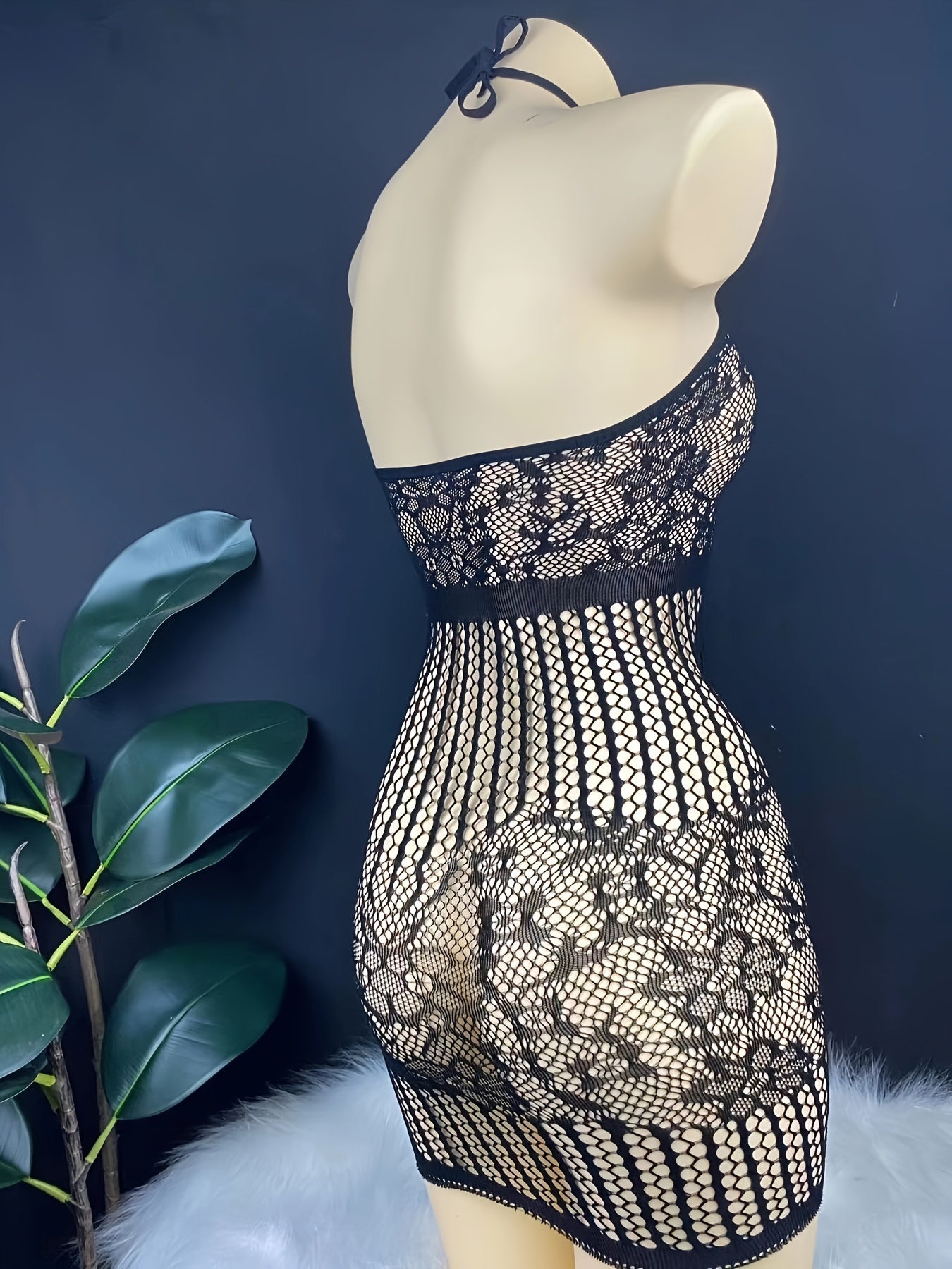 Women’s Lace Mesh Backless Bodysuit with Halter Neck and Nylon Elastane Fabric