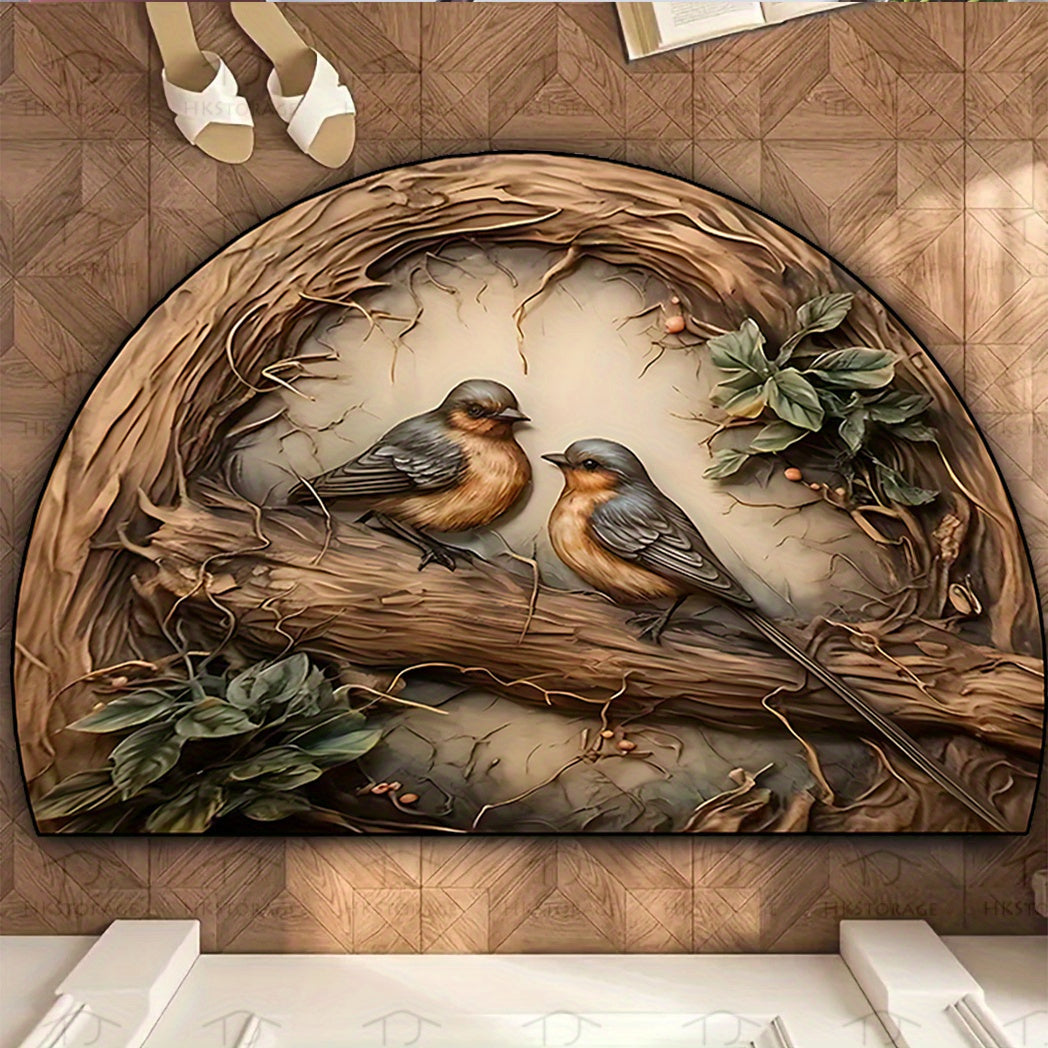 Semi-Circular Bird and Branch Doormat Non-Slip Rubber Backing Indoor Outdoor Durable Polyester