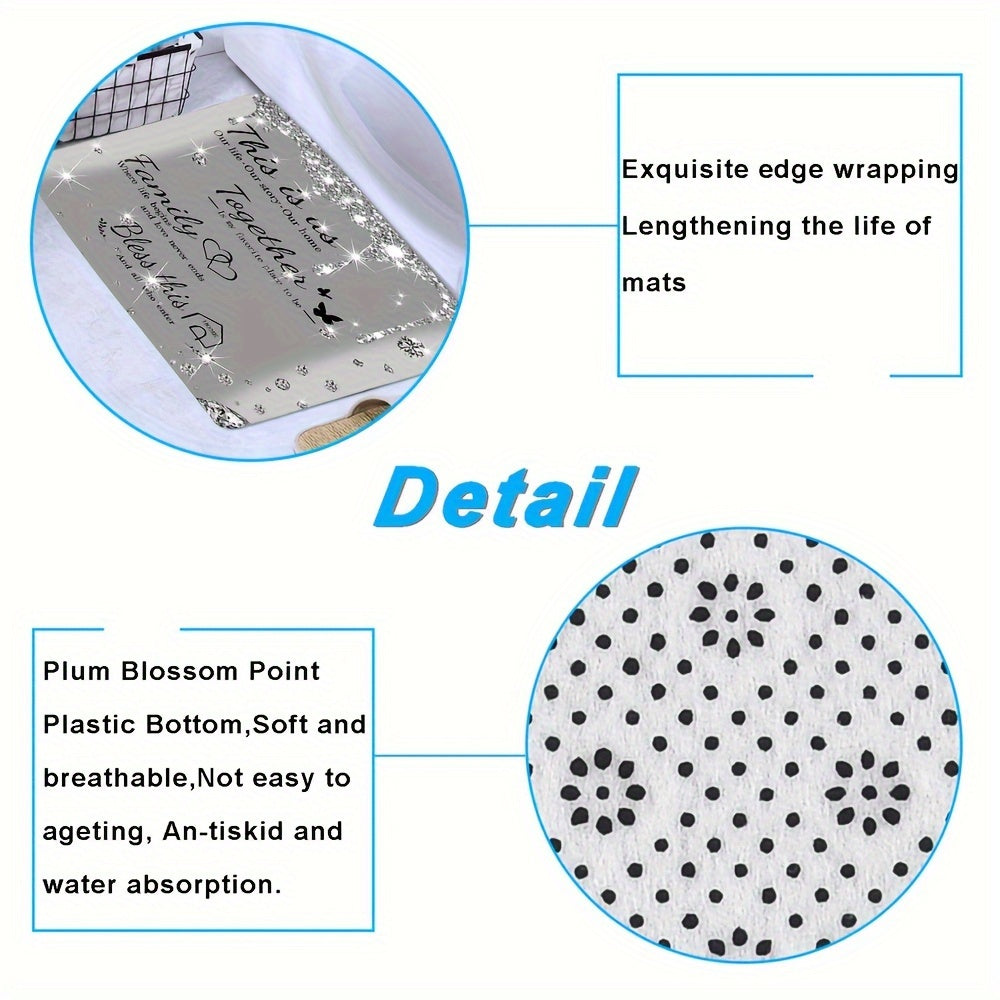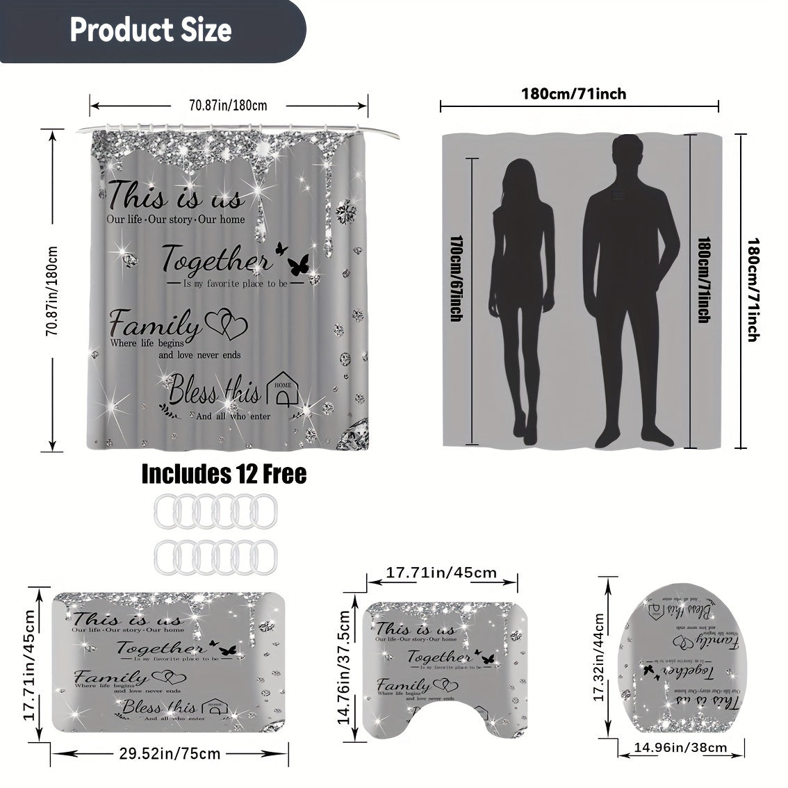 Set of 4 Gray Shower Curtains with Diamond Letter Print Bath Mats Non-Slip Carpet Toilet Lid Cover Bathtub Partition