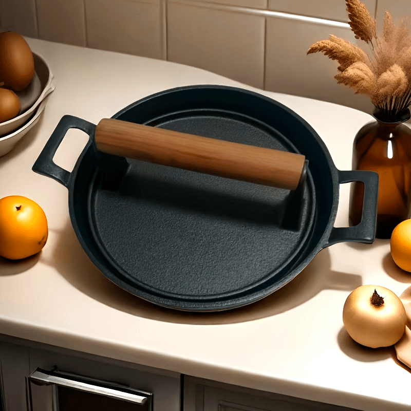 Cast Iron Frying Pan Meat Press and Steak Board Set for Grilling and Cooking