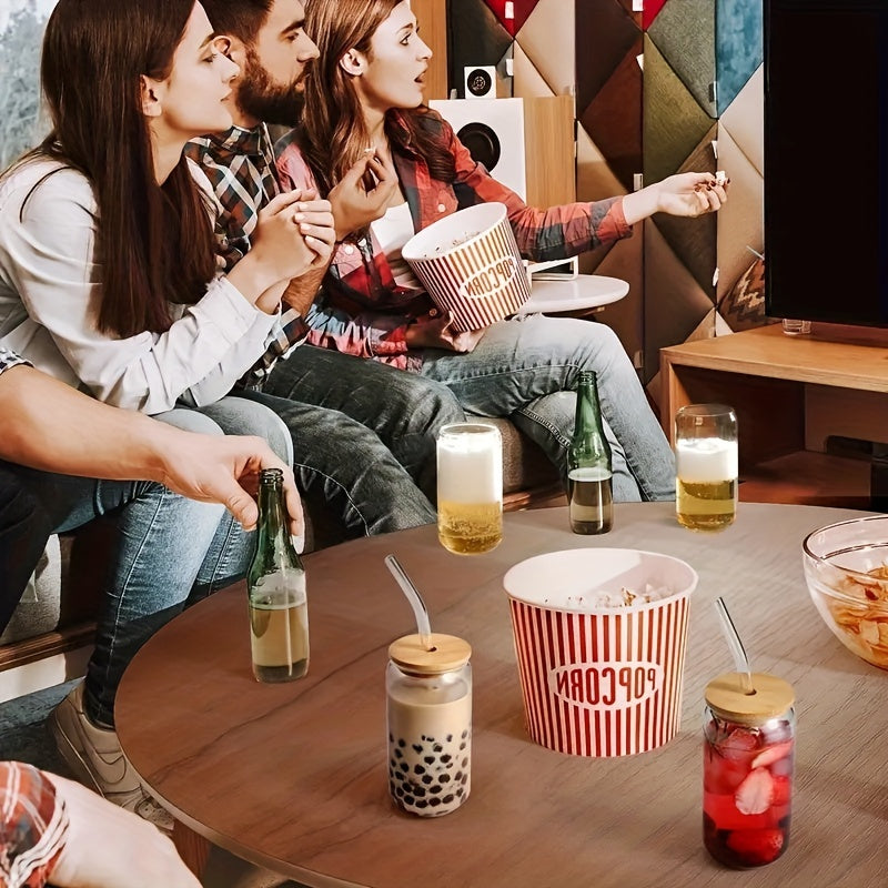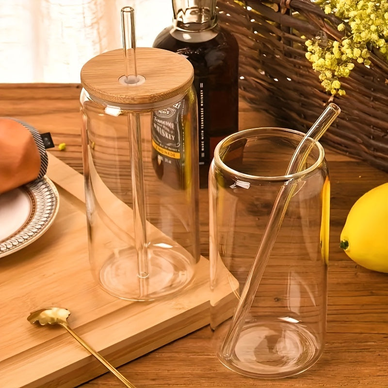 Set of Drinking Glasses with Bamboo Lids and Glass Straws 16oz Can Shaped Cups for Beer Iced Coffee Cocktails