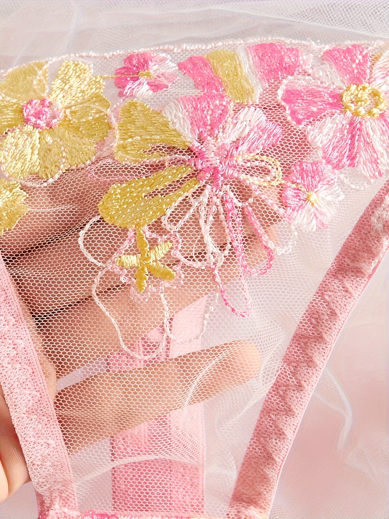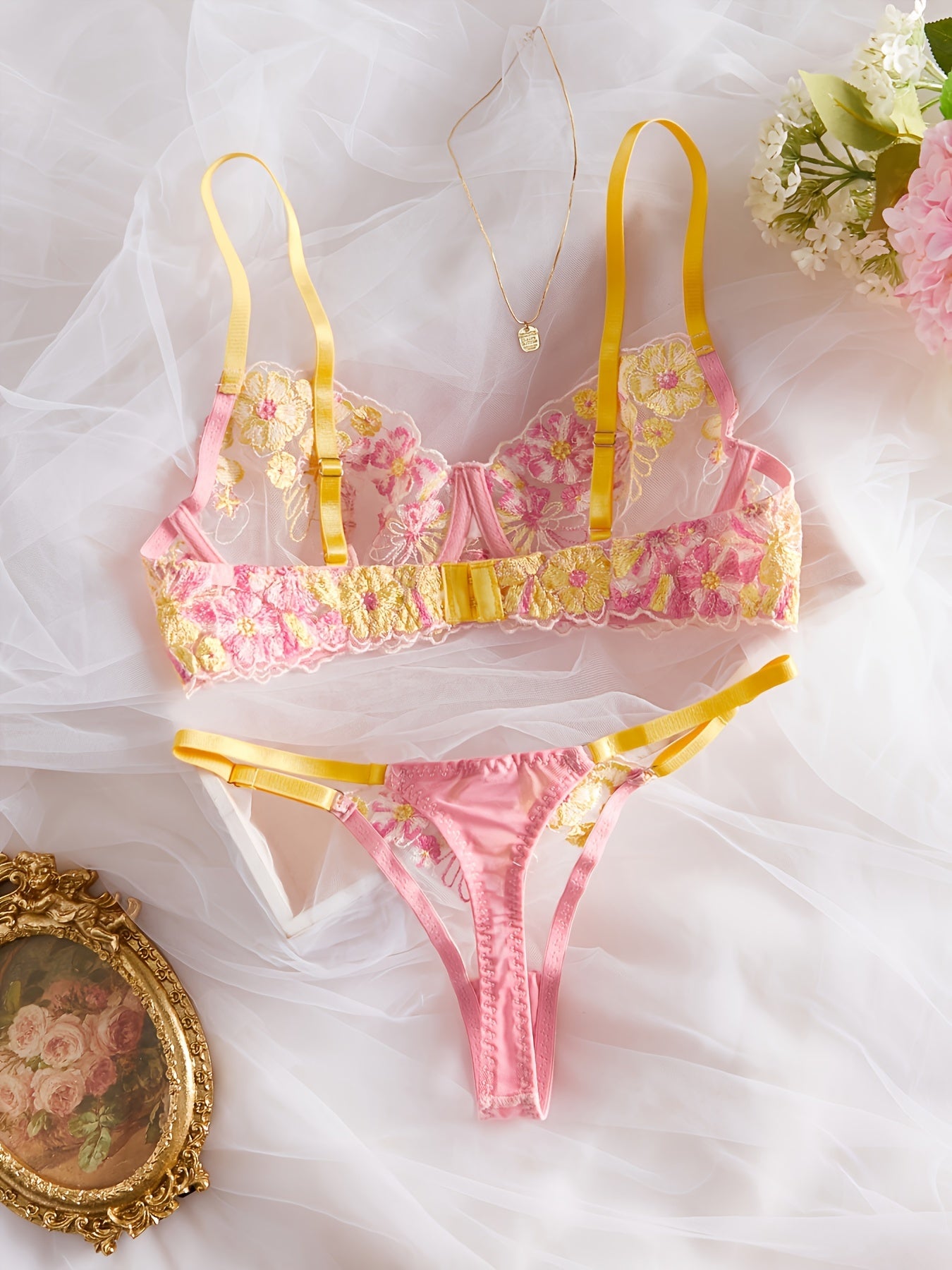 Women's Lace Satin Lingerie Set with Adjustable Straps and Floral Design