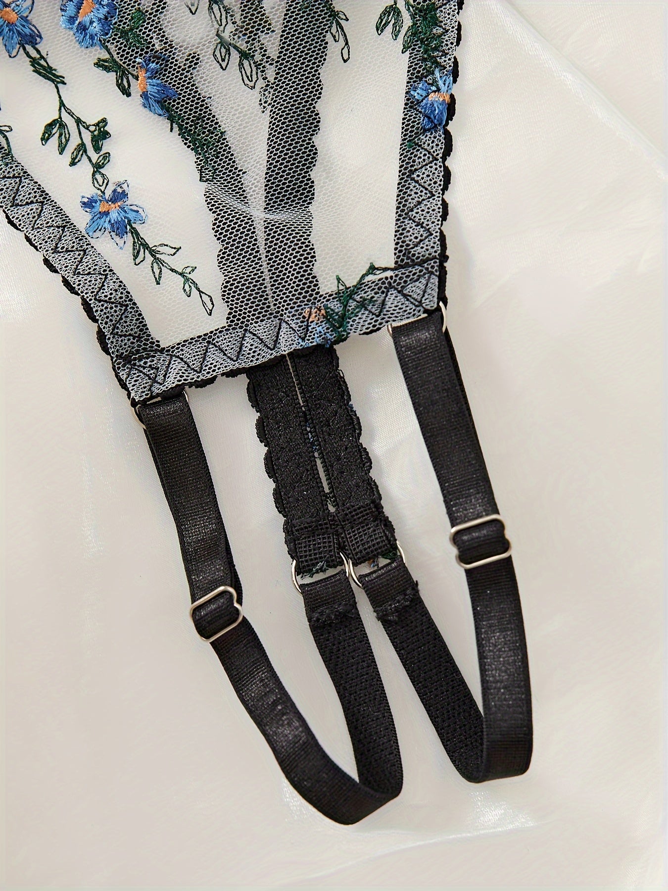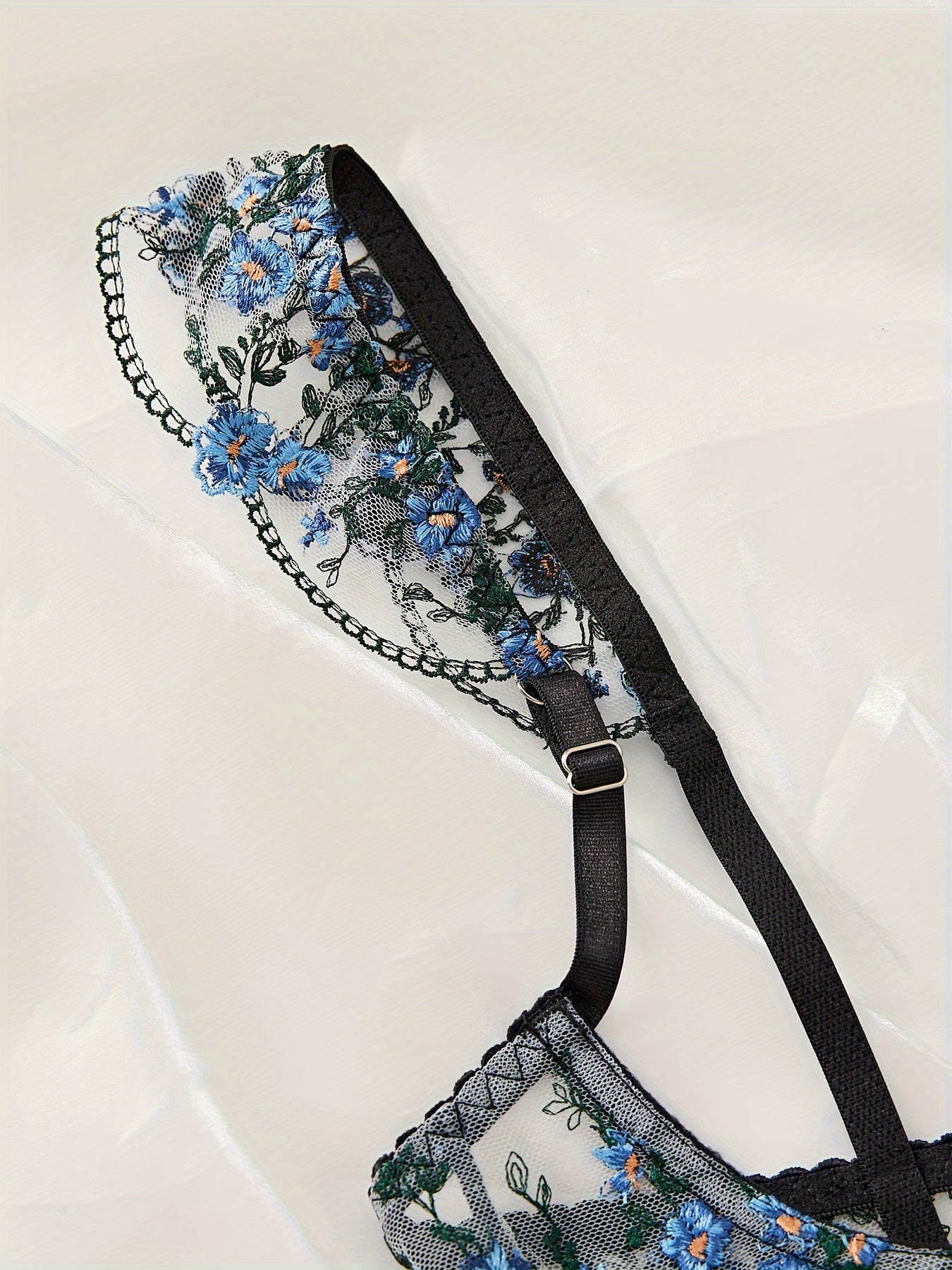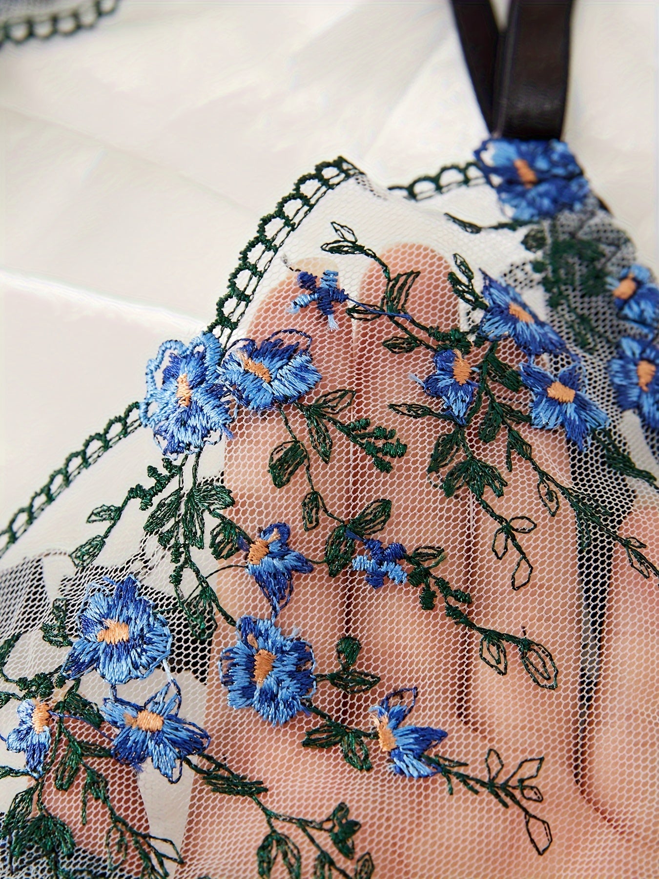 Sheer Mesh Lingerie Set with Flower Pattern Cupless Bra and Thong