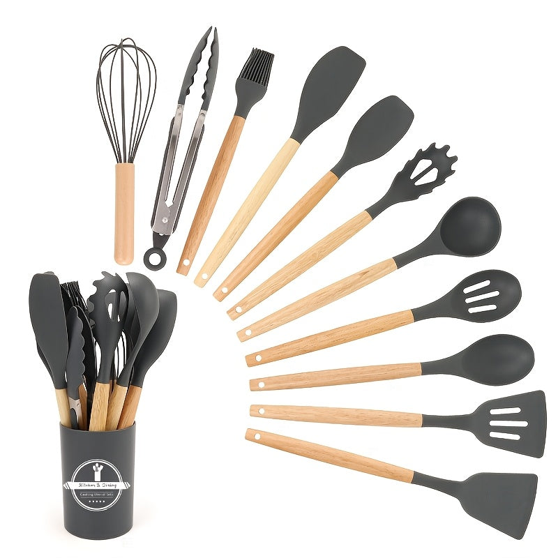 Silicone Kitchen Utensil Set 12 Pieces Non-Stick Food-Safe Cooking Tools with Wooden Handles