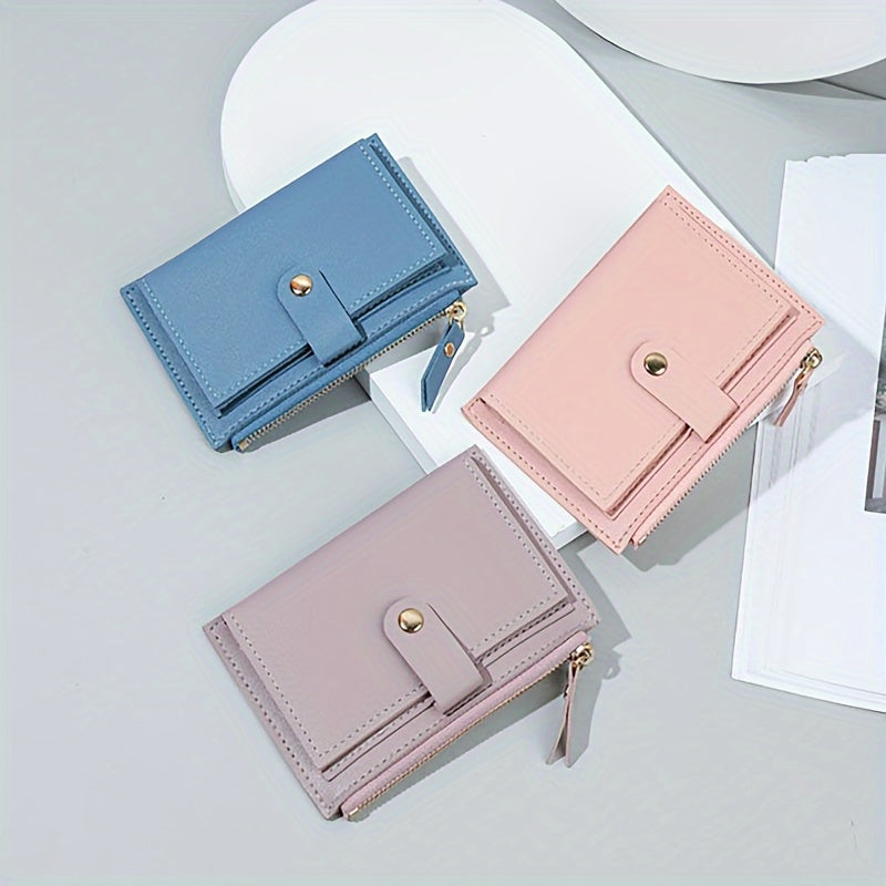 Women's Bifold Wallet with Zipper Snap Button in Pink Blue Black Light Brown PU Material