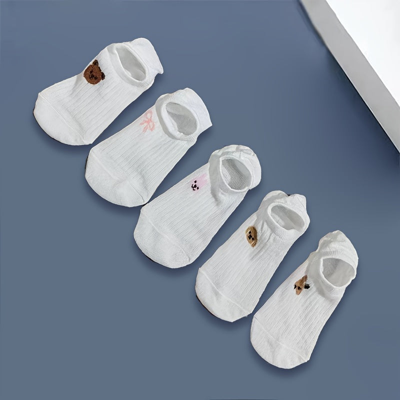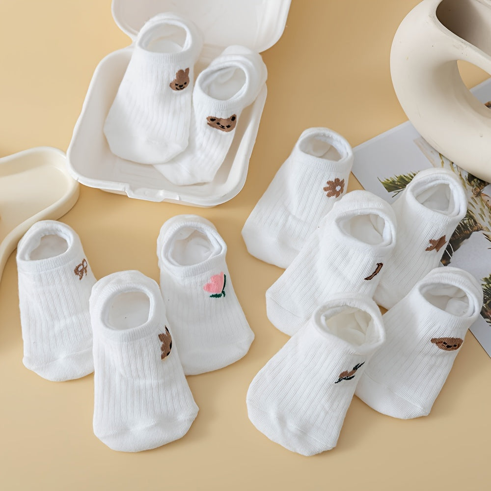 Kids Ankle Socks Pack of 5-10 Breathable Polyester Blend with White Stripes and Cute Animal Designs