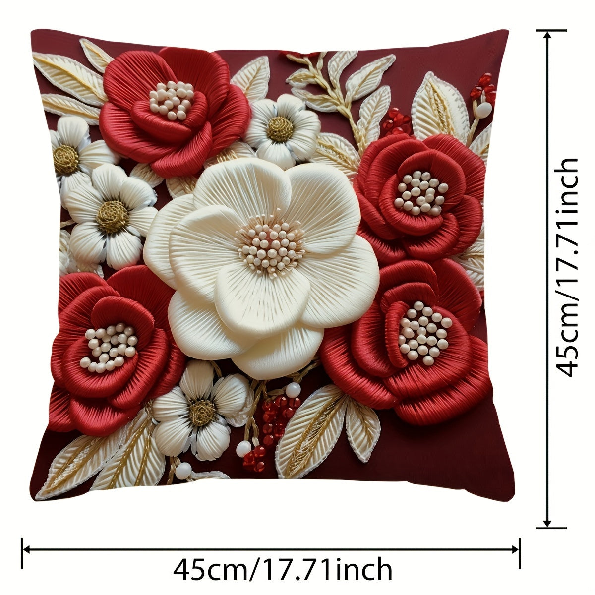 3D Floral Print Plush Throw Pillow Cover Red White 44.96cm x 44.96cm Zip Closure