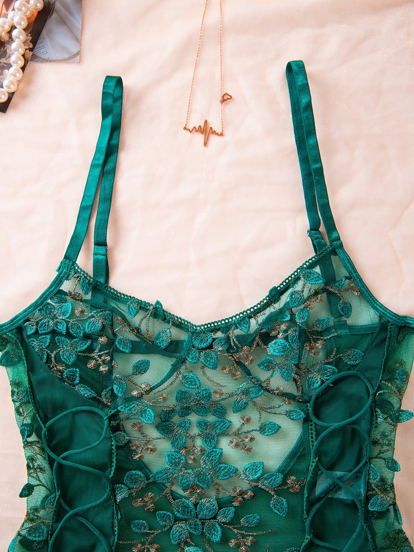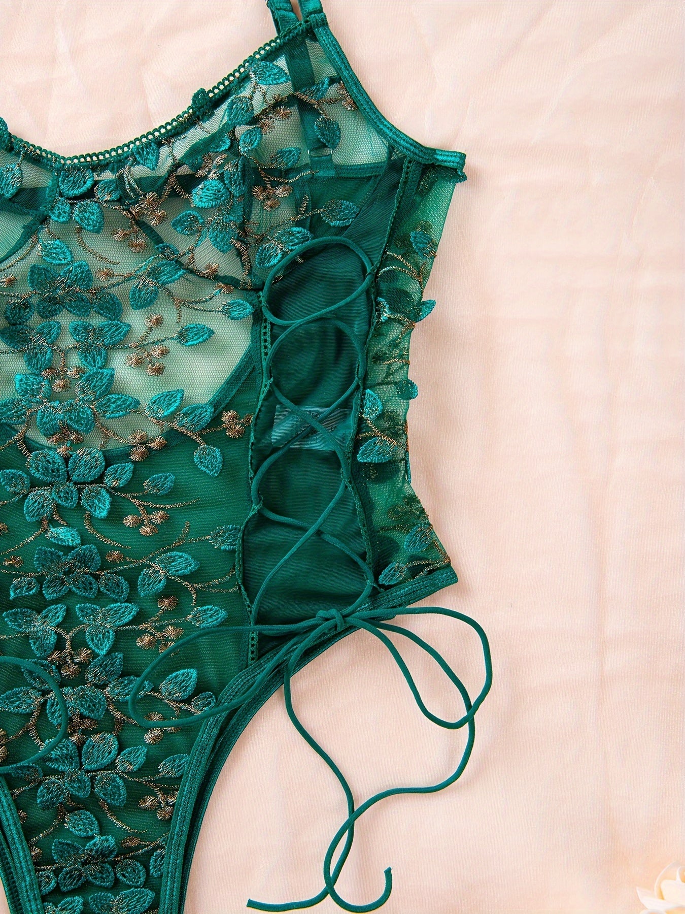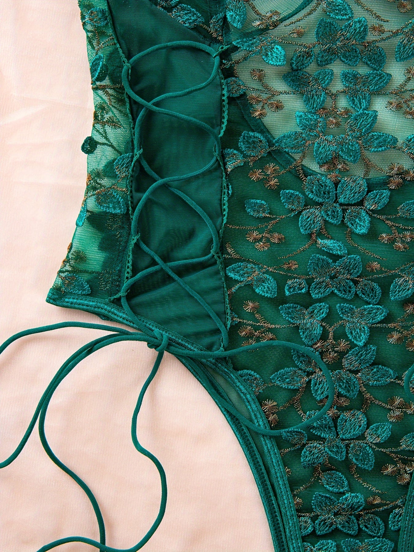 Women's Floral Lace Teddy and Mesh Backless Thong Lingerie