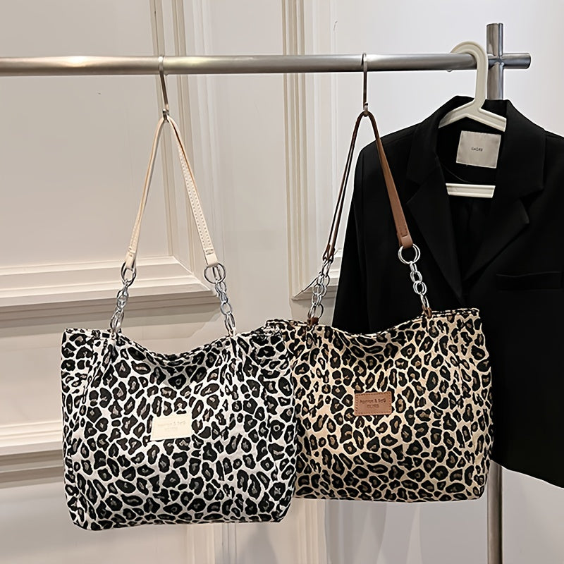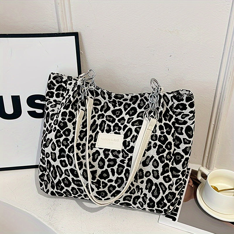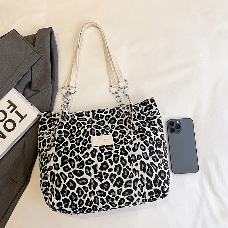 Women’s Corduroy Shoulder Bag with Leopard Print and Polyester Lining