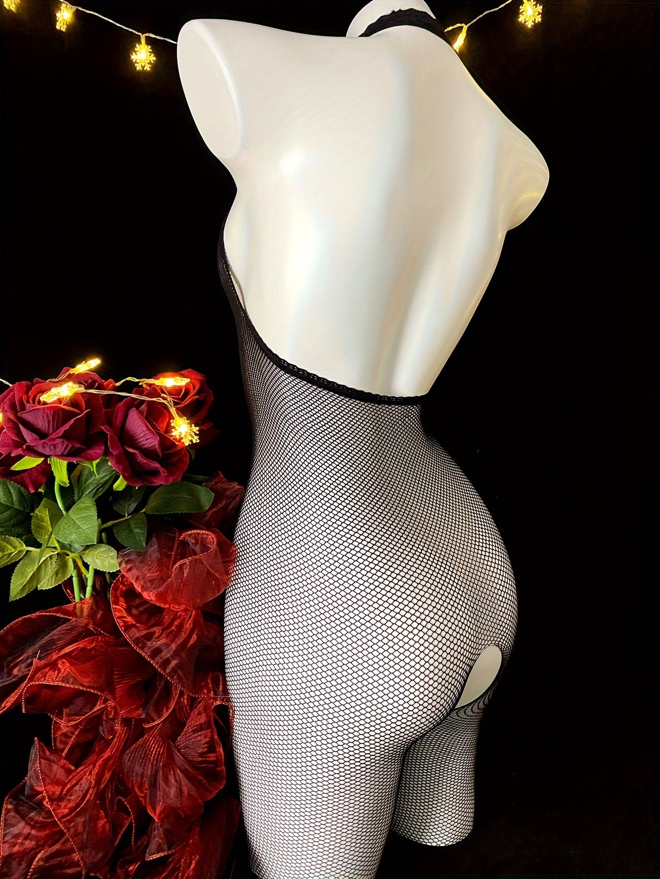 Houndstooth Mesh Bodysuit with Black Lace Halterneck Backless Sheer Fabric