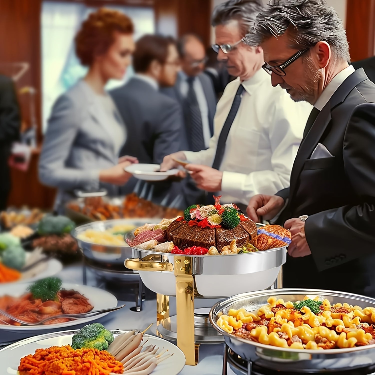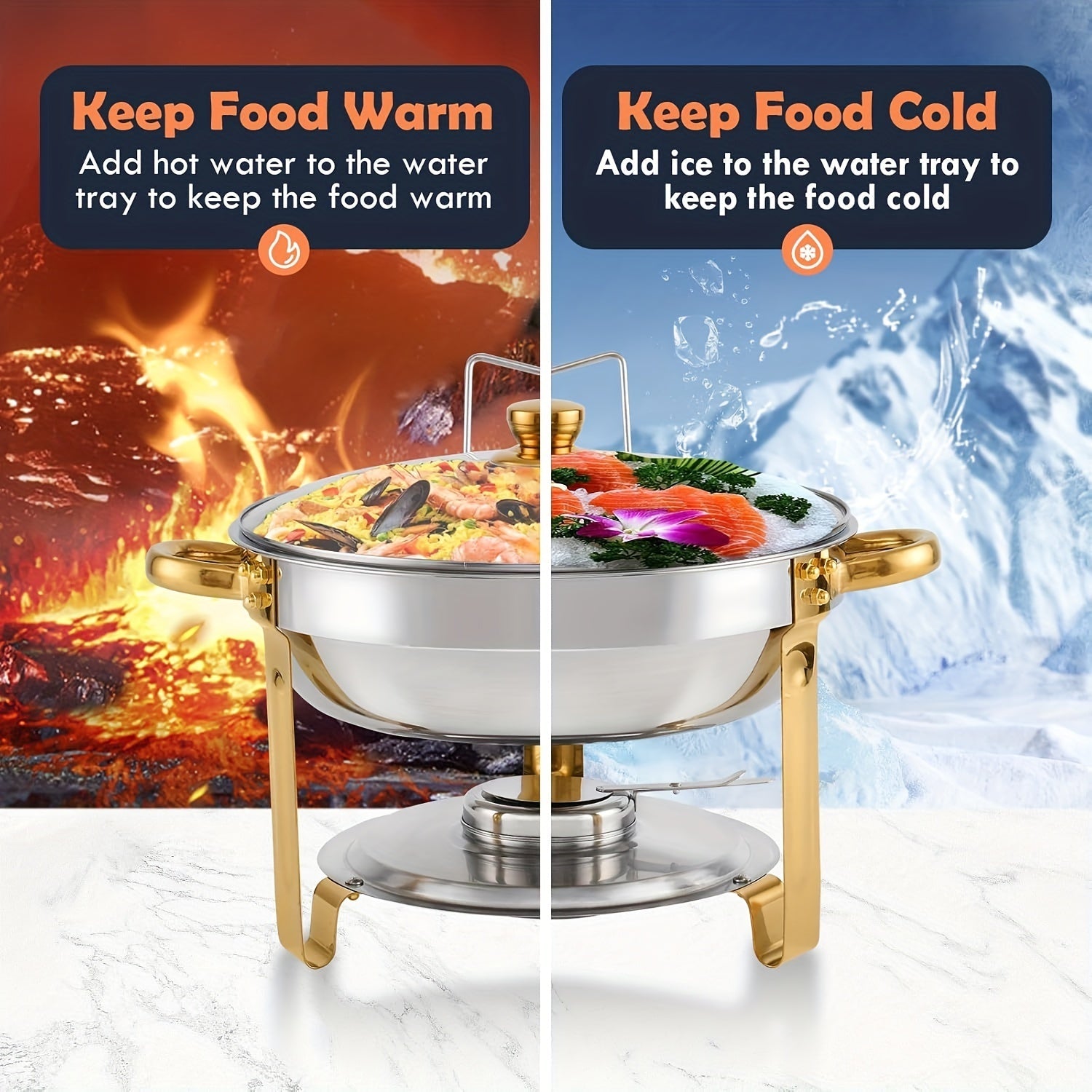 Set of Four 4-Quart Gold Chafing Dishes with Glass Lids and Lid Holders