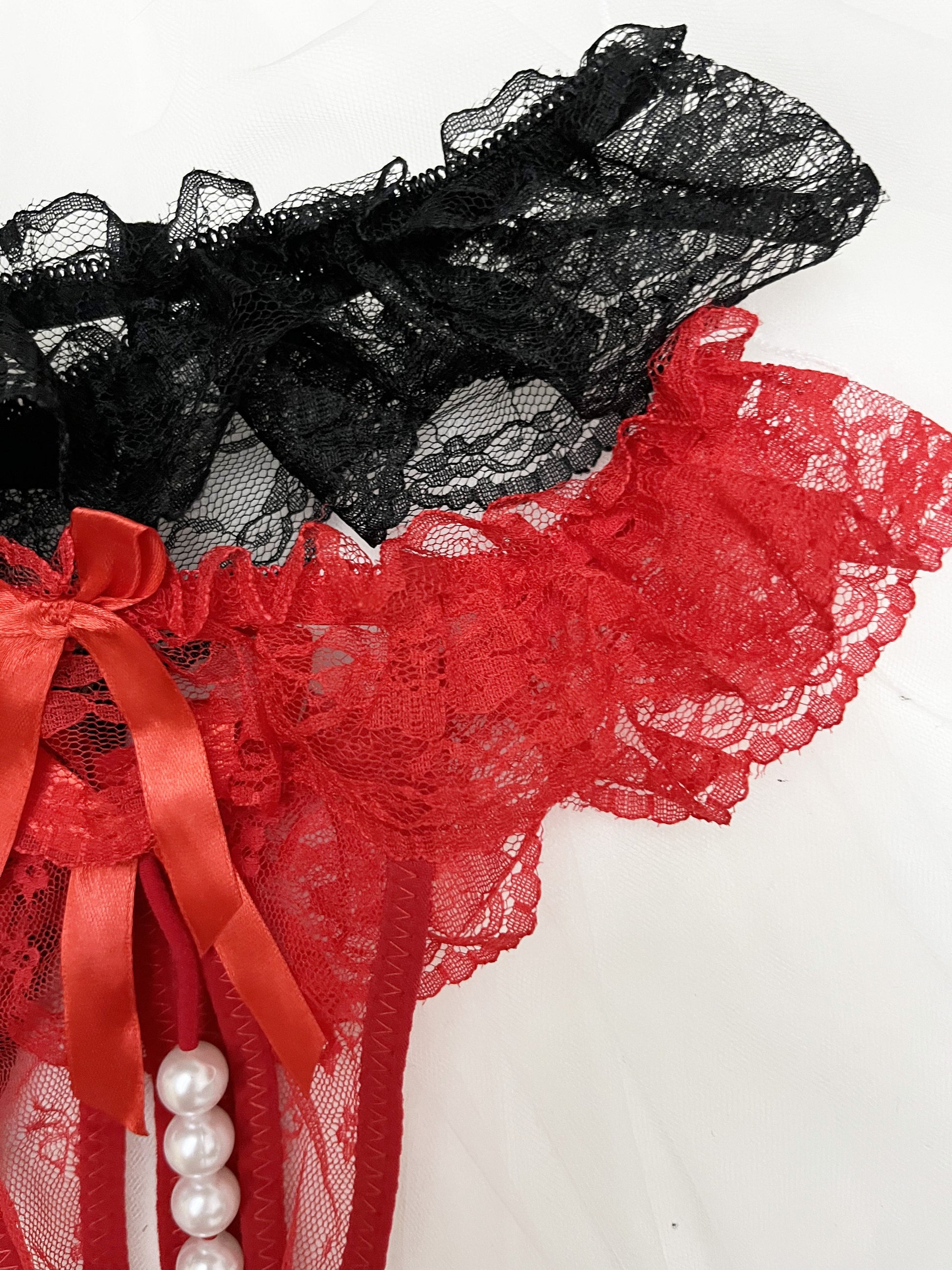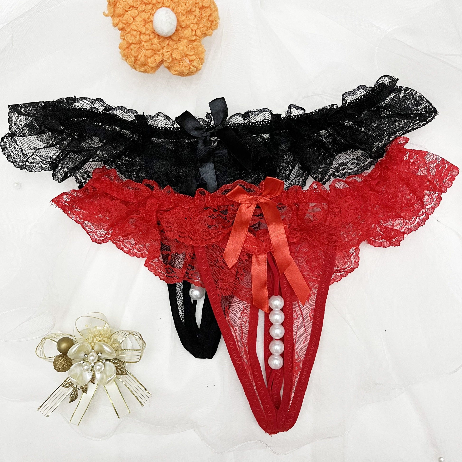 Two Pack Solid Color Lace Thongs with Double Bow and Beaded Detail