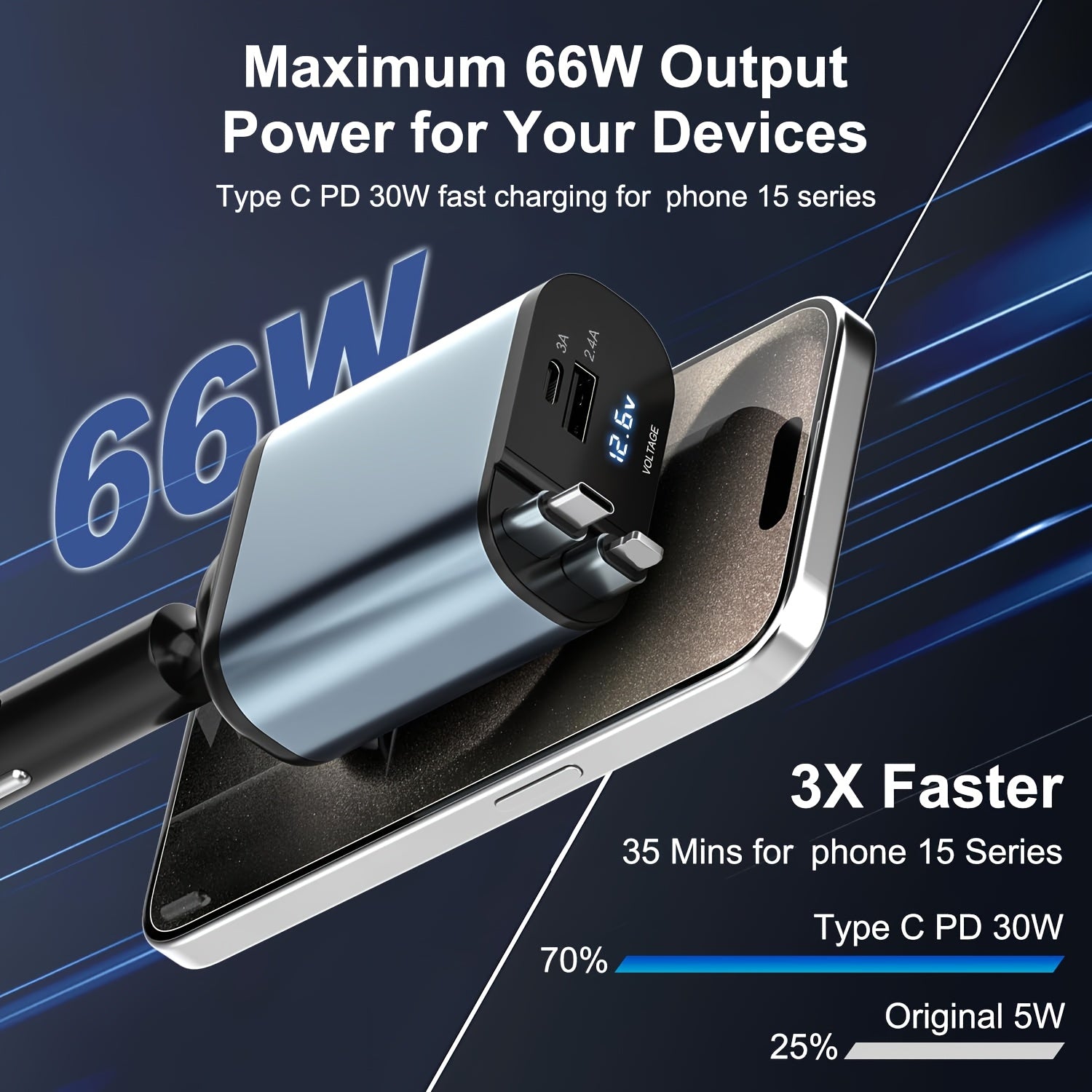 Universal Retractable 66W 4-In-1 Fast Car Charger with USB Ports