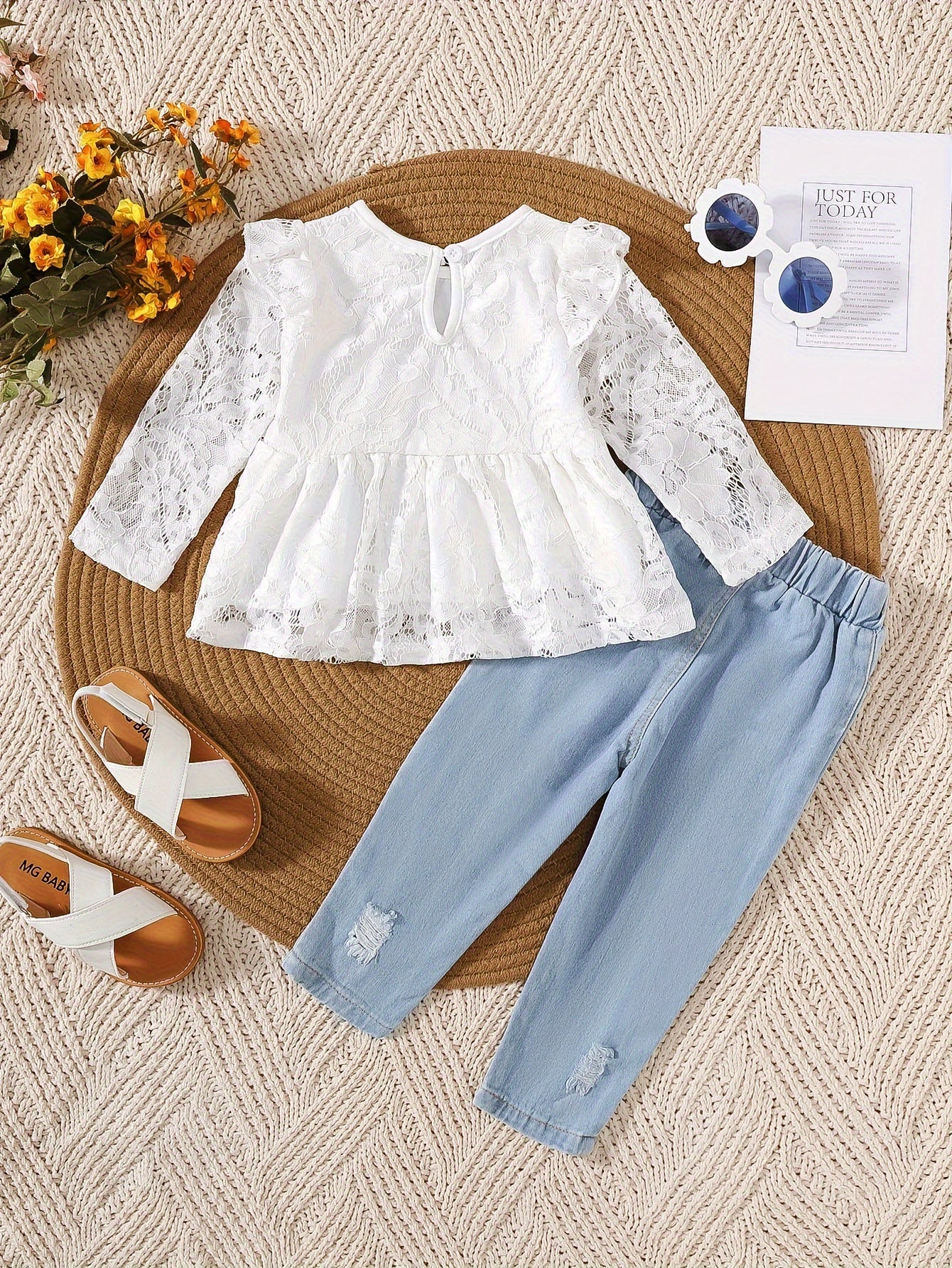 Girls' White Lace Fly Sleeve Top and Ripped Denim Jeans Set for Spring Summer Fall