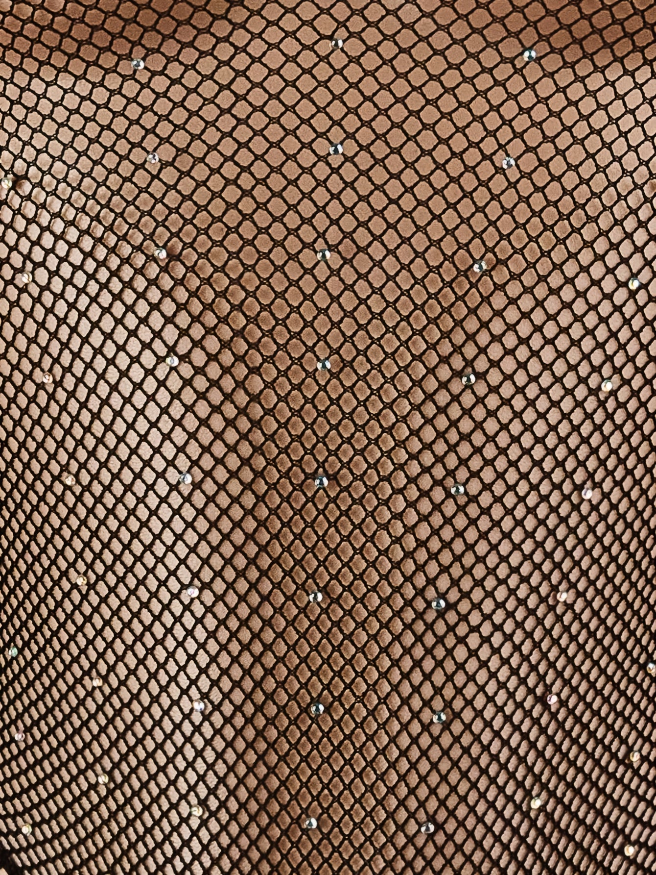 Women's Black Mesh Rhinestone Bodysuit with Vertical Print High-Stretch Nylon for Adults