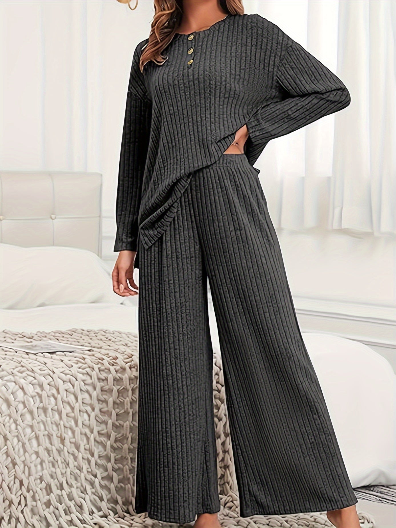 Women's Casual Suit with Ribbed Knit Top and Wide-Leg Hooded Pants