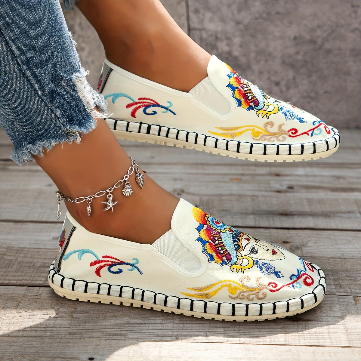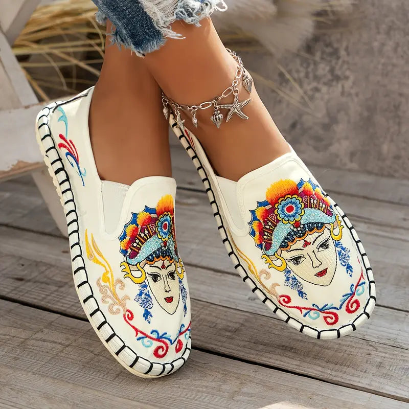 Women's Embroidered Canvas Flats Lightweight Soft Sole Walking Shoes