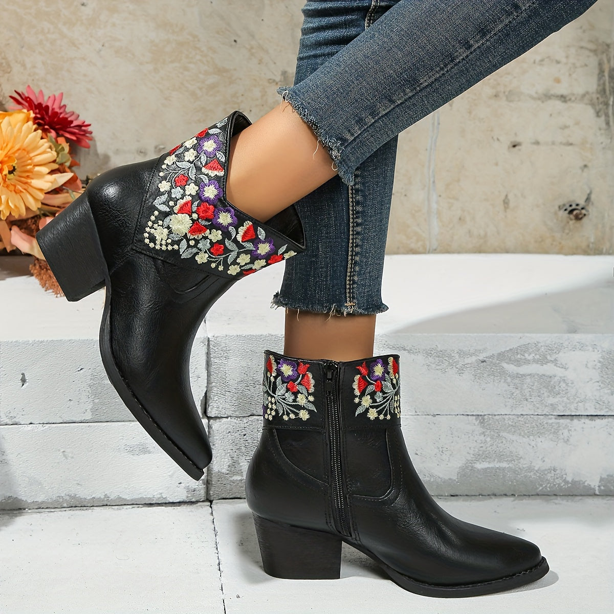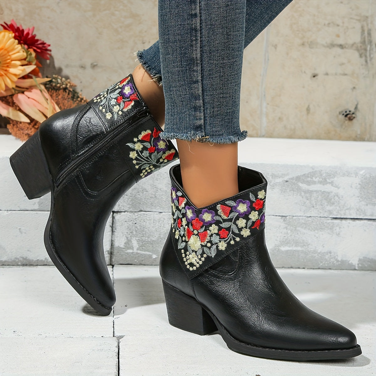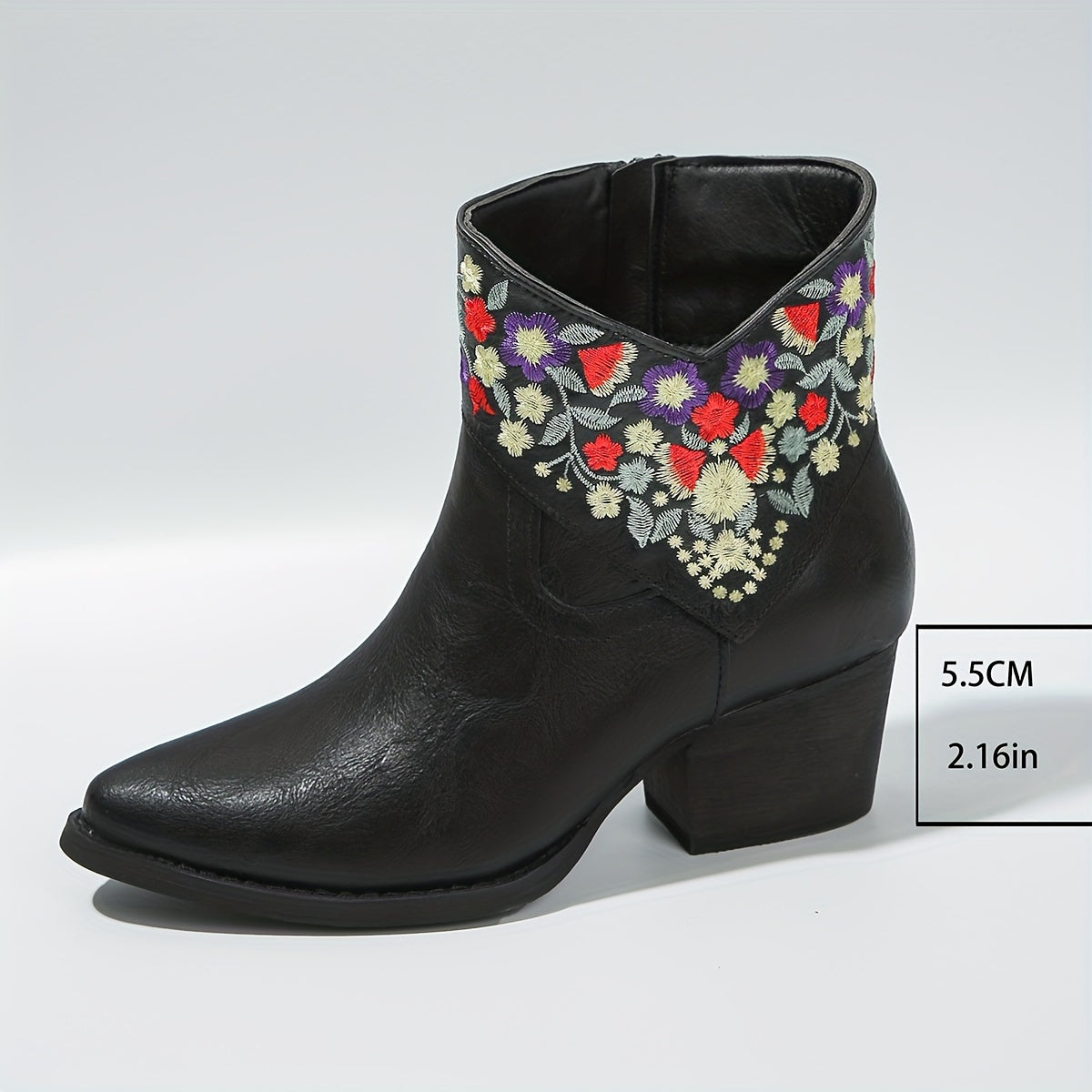 Women's Flower Pattern Chunky Heel Short Boots Leather Point Toe Ankle Zipper